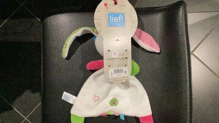 Prix non négociable, merci de votre compréhension. Le doudou est neuf encore avec son carton d’origine il est plat pour le corps style mouchoir en velours blanc tête peluche petit nœud bleu au niveau d’une oreille. Le nez est rose il y a également du vert petit bandana autour du cou, motifs, cœur, brodé, bleu, rose, vert. Carreaux vichy pour une oreille Lief lifestyle