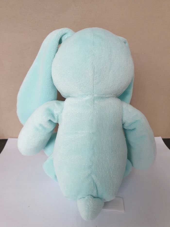 Préfixe réduction activée pour les lots je vous propose cette peluche en velours bleu ciel bleu clair grandes oreilles les yeux le nez la bouche sont brodés en gris également brodé empreinte au niveau des pâtes jambes article en super-État marque Simba toy Benelux Kiabi hauteur environ de la peluche sans les oreilles 22 / 23 cm