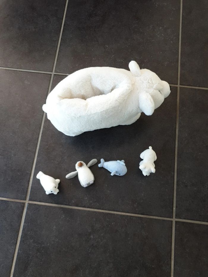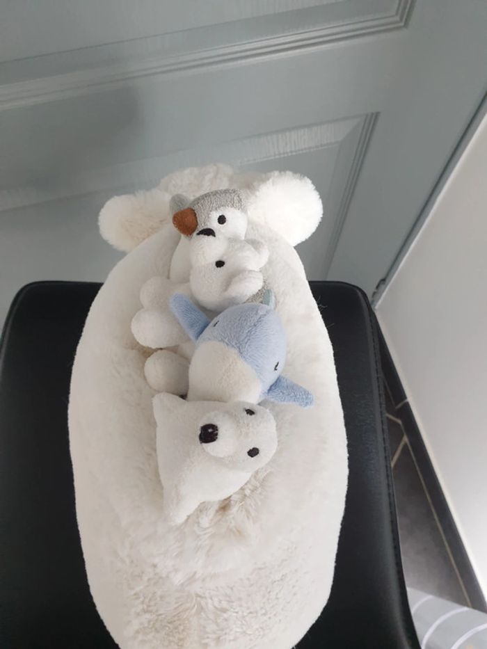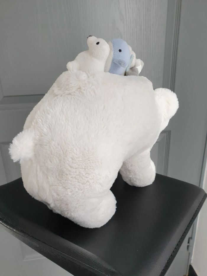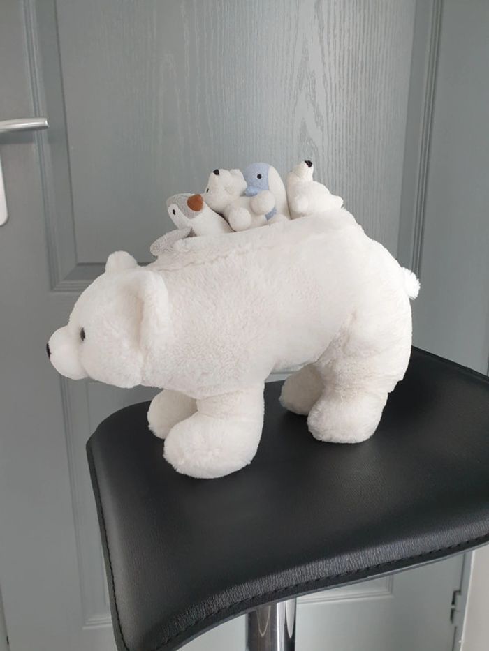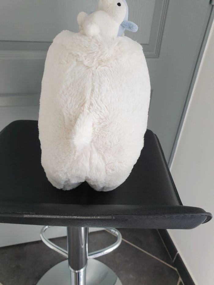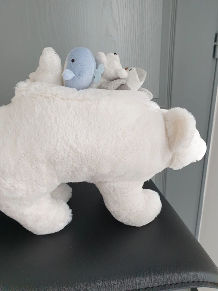Mon prix est fixe merci d'une hauteur d'environ 22 cm pour une longueur de 35 cm environ très belle ours polaire en fourrure blanc ouverture dans le haut du dos pour y mettre ses amis son petit ourson la baleine bleue le (phoque) otarie blanc et le pingouin gris