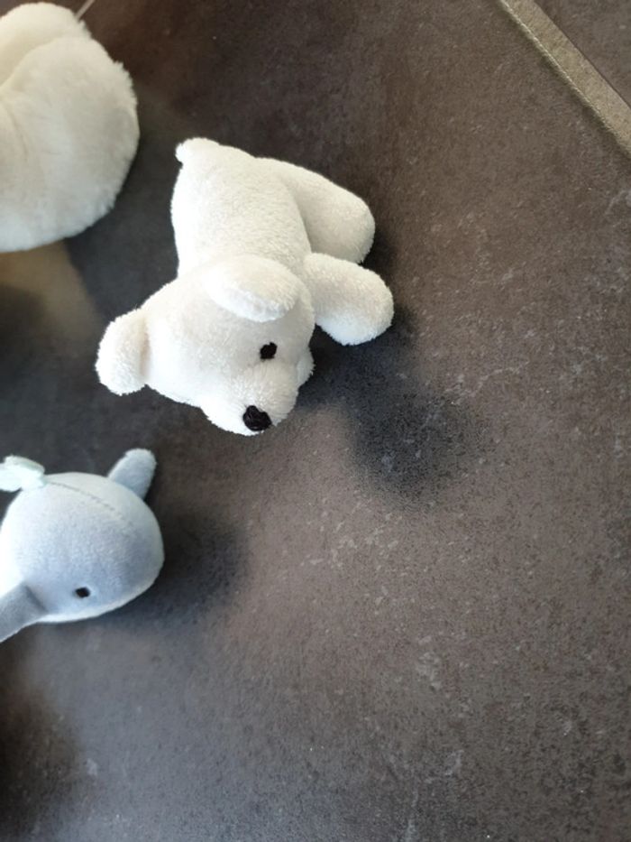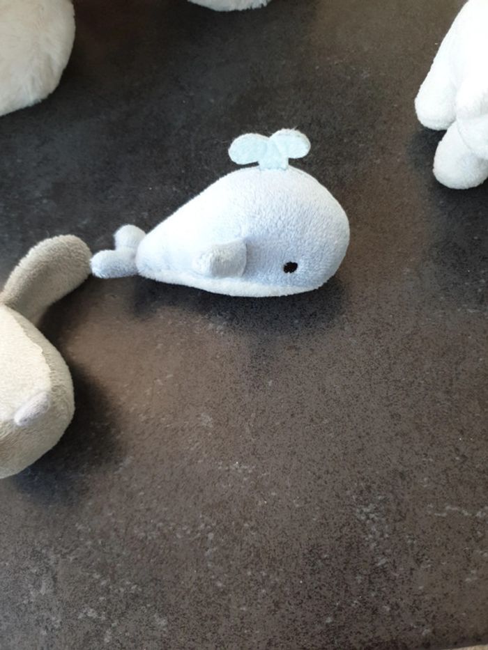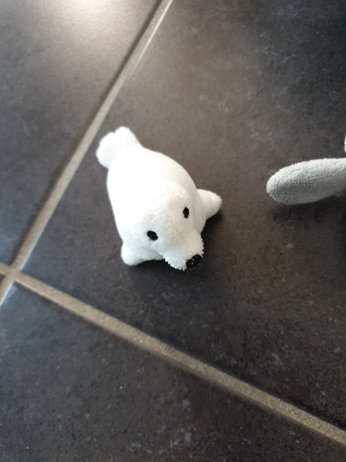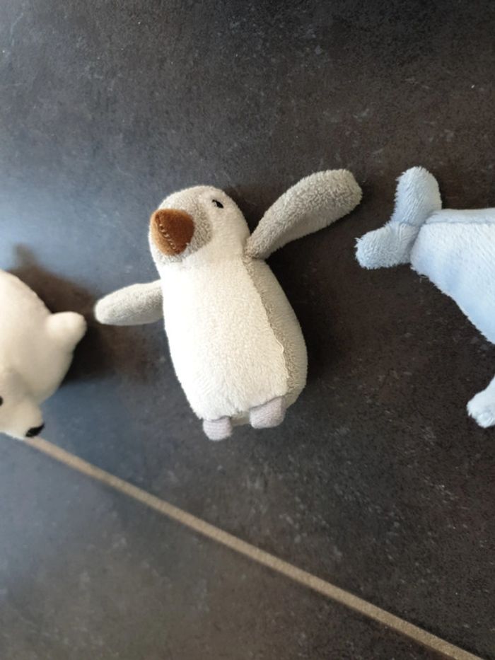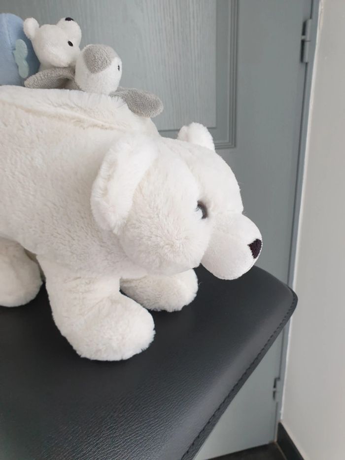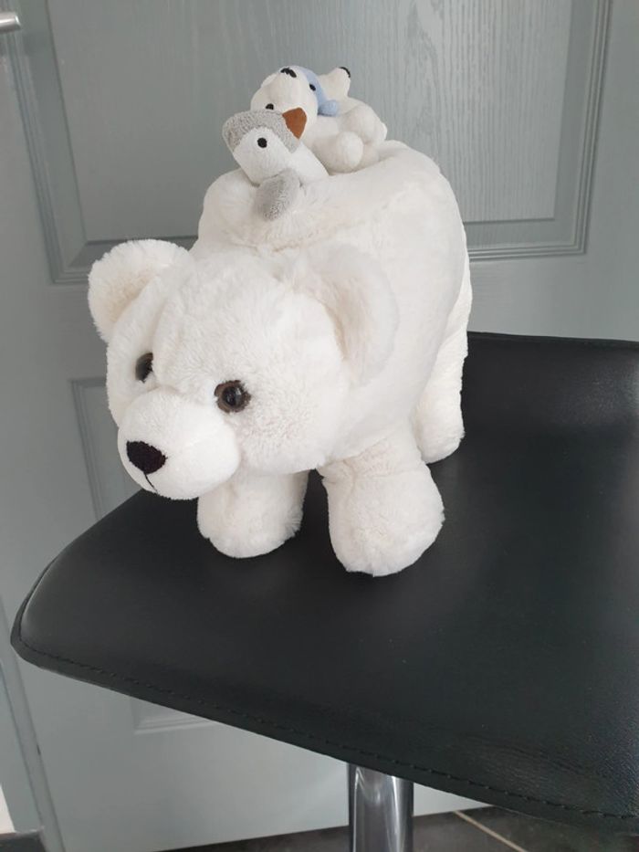 Mon prix est fixe merci d'une hauteur d'environ 22 cm pour une longueur de 35 cm environ très belle ours polaire en fourrure blanc ouverture dans le haut du dos pour y mettre ses amis son petit ourson la baleine bleue le (phoque) otarie blanc et le pingouin gris
