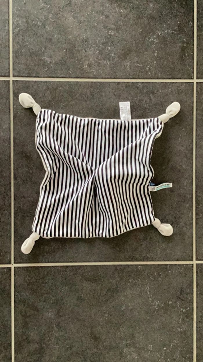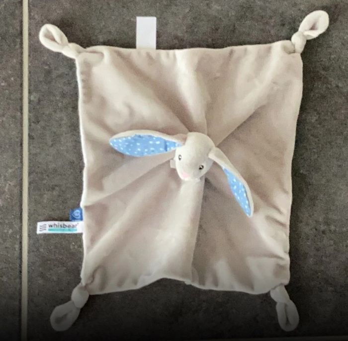Il est plat style mouchoir en velours gris pour le dessus. Le dessous est en tissu rayé blanc noir au centre, une tête peluche avec un nœud au niveau du cou en satin ruban. Le nez est rose les yeux sont brodés intérieur oreilles, tissu bleu, motifs blancs, 4 nœuds État impeccable jamais utilisé
