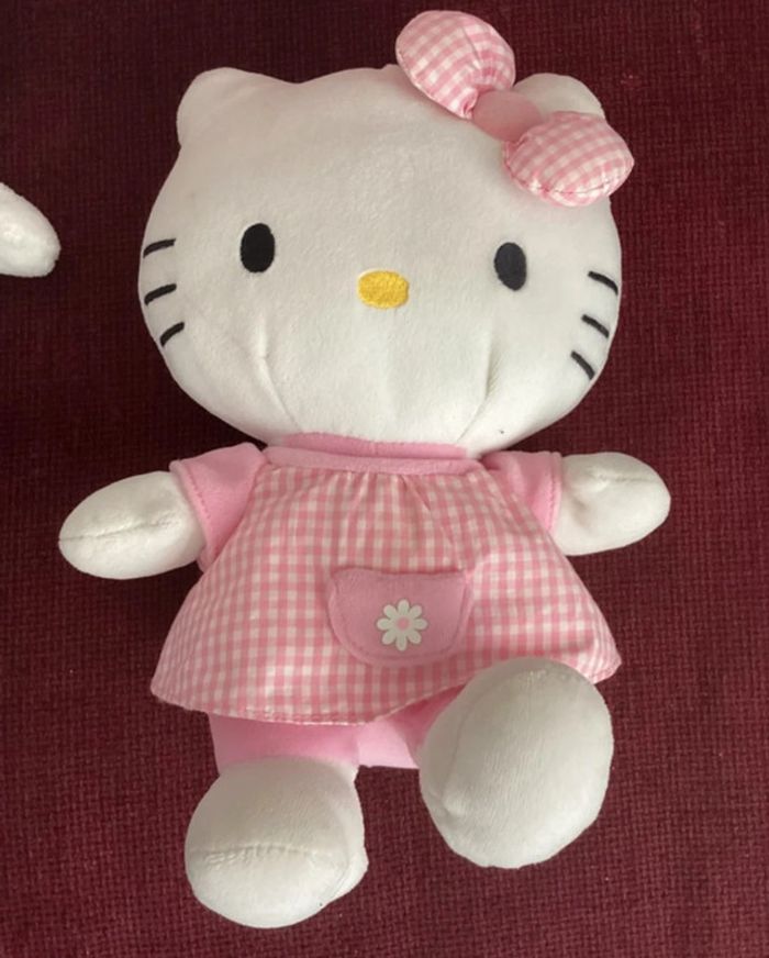 Mon prix est fixe, réduction activée pour les lots. Je vous propose cette peluche chat hello kitty , velours, blanc, rose, robe vichy, carreaux poche, Marguerite. Une bonne vingtaine de centimètres assise