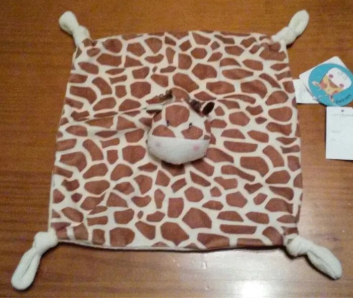 Mon prix est fixe, merci je vous propose ce doudou neuf avec étiquette savane carré blanc paris Marron beige 4 noeuds une face tachetée une face unie Tête girafe au centre Museau blanc
