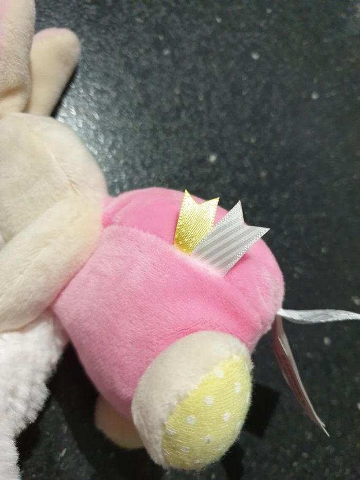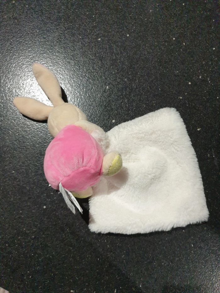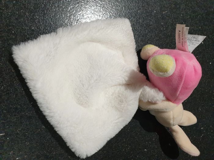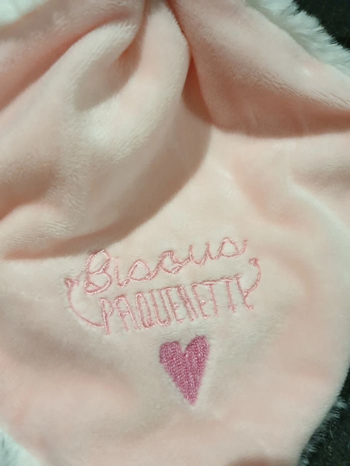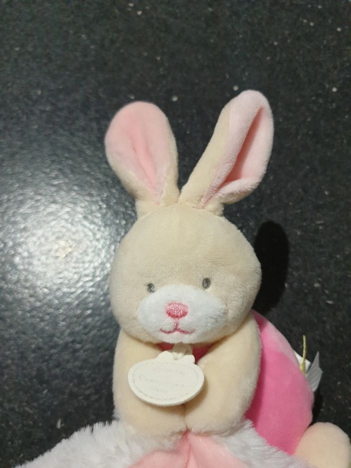 Petite peluche boule lapin couleur rose beige blanc tenant son doudou mouchoir dans les bras brodé bisous pâquerette velours rose cœur fourrure Collection bisous PM DC 3340 DC3340