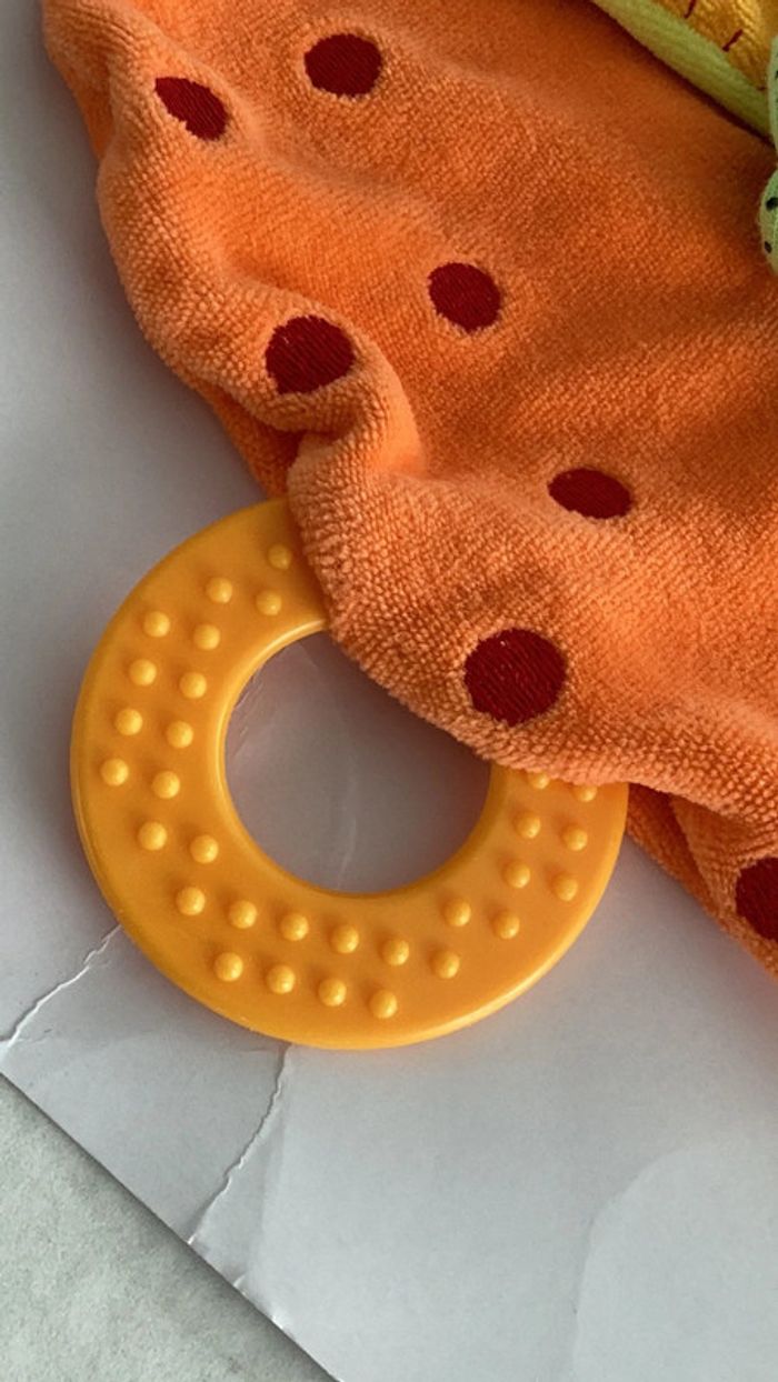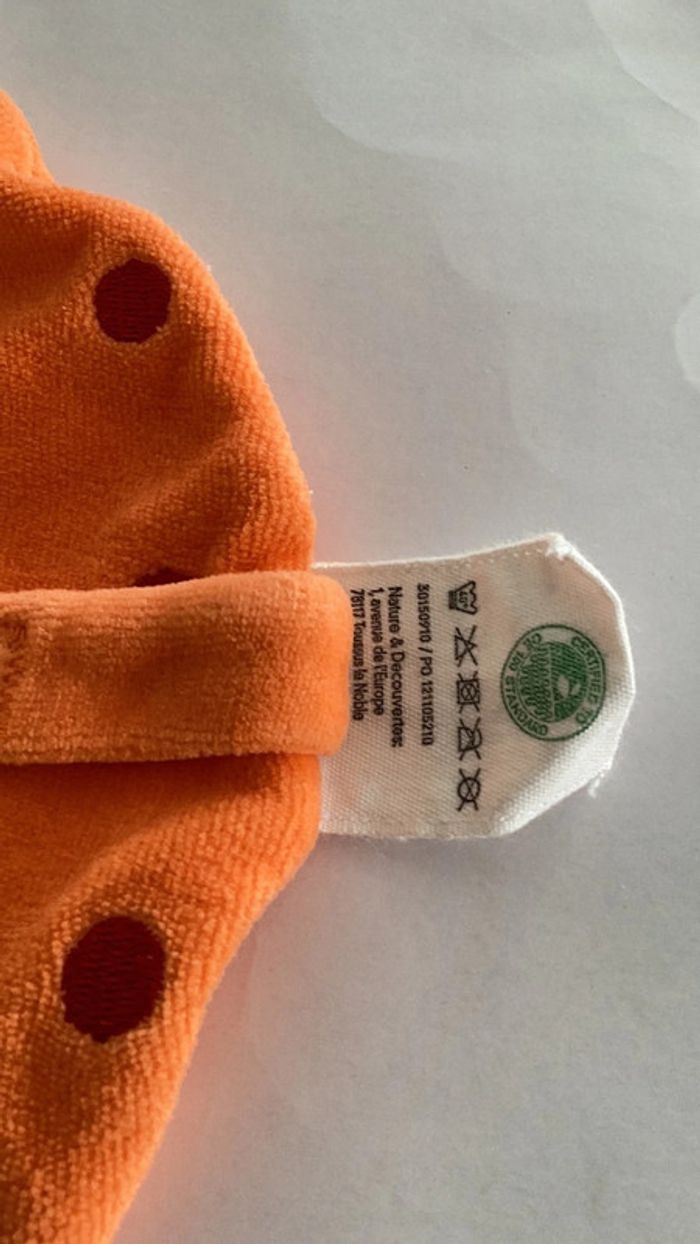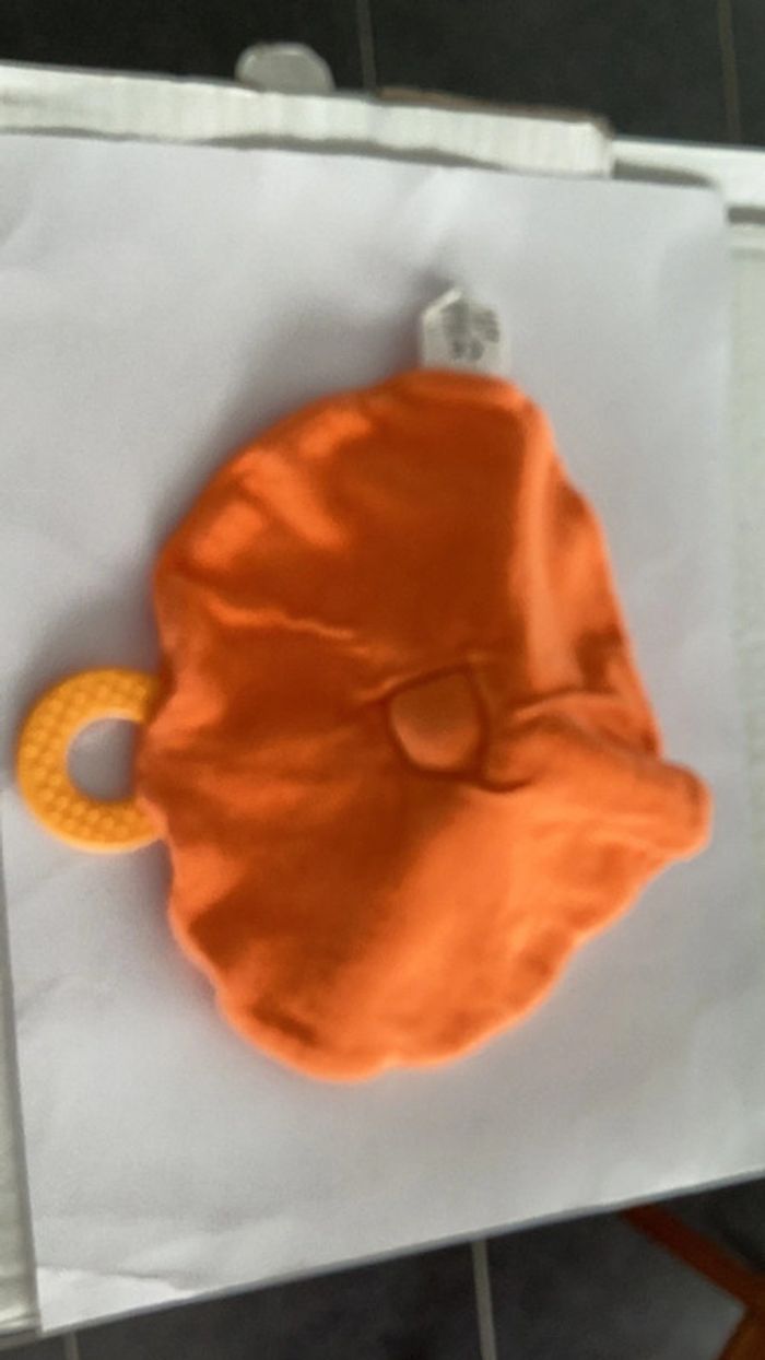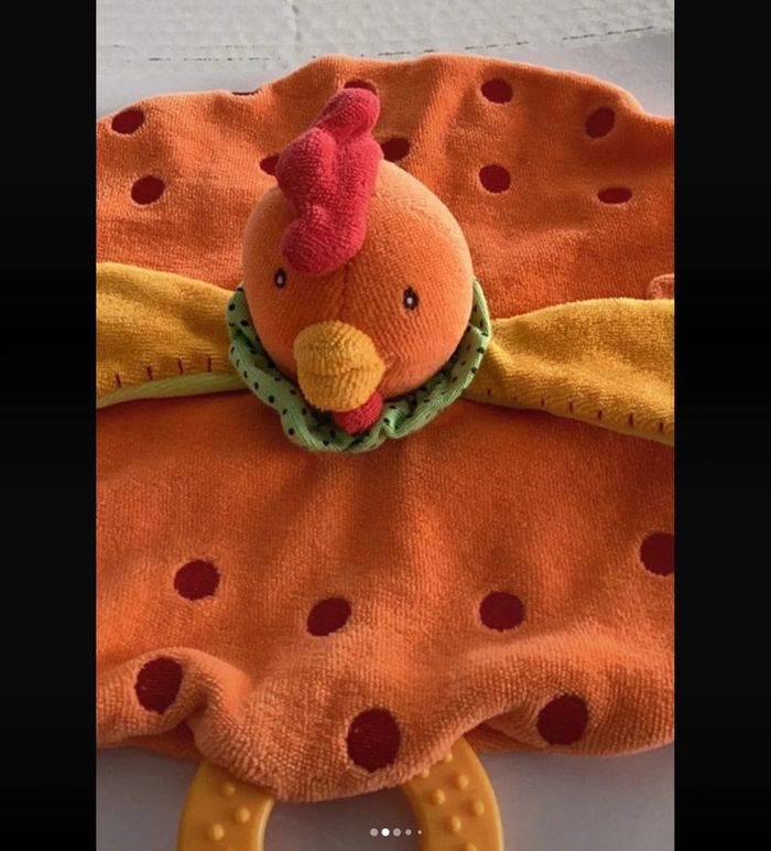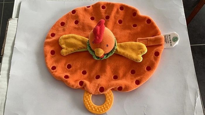 C’est un doudou plat rond ovale en velours orange avec des Broderies rouge. anneau de dentition jaune, attache tétine tutute sucette, peluche tête poule ou coq au centre avec des ailes et une collerette verte en tissu avec des points noirs. Le doudou n’a jamais été utilisé simplement lavé