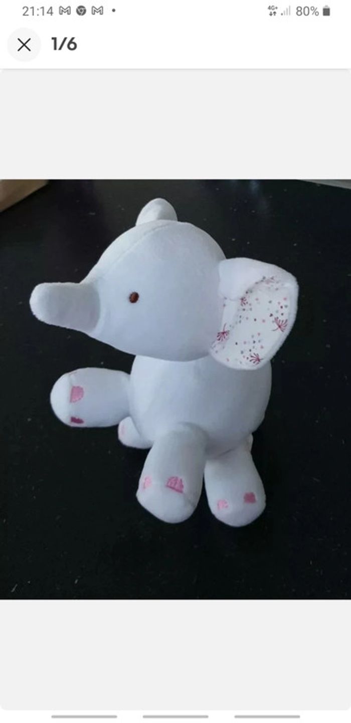 Petite peluche éléphant velours blanc motif au niveau des oreilles brodés rose au niveau des pattes
