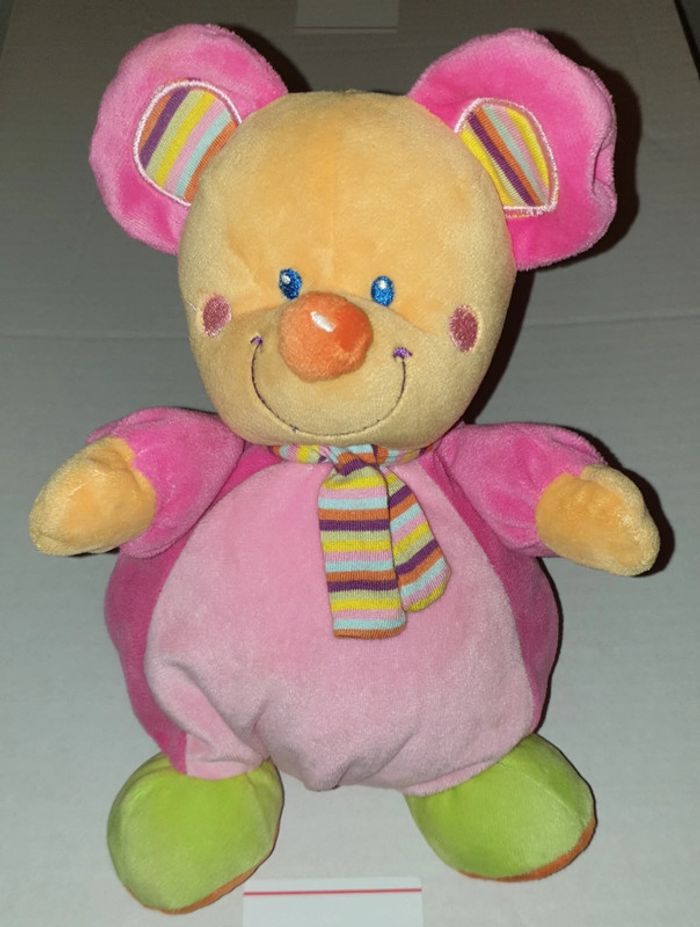 Prix non négociable merci Très belle peluche souris rose de chez leclerc Marque mots d'enfants avec un lien derrière pour l'attacher éventuellement Couleur vert orange rose clair rose foncé écharpe rayée jaune orange bleu violet