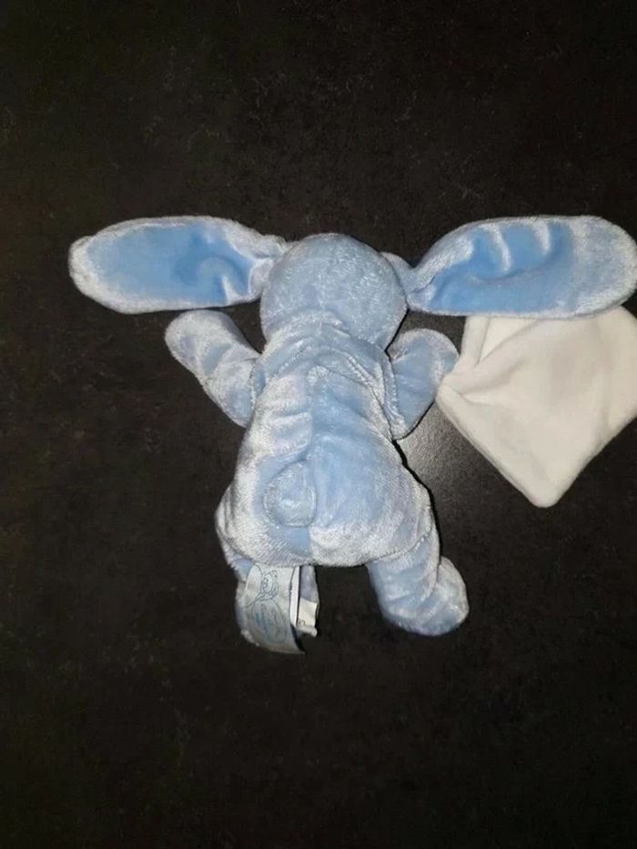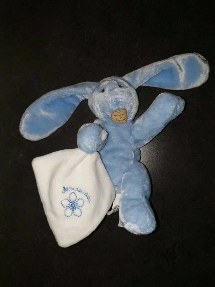 Doudou lapin velours bleu tenant son doudou mouchoir dans la main bille dans les fesses excellente état non utilisé le doudou mouchoir est en velours blanc brodé mon doudou avec fleur allongé il mesure environ une petite vingtaine de centimètres