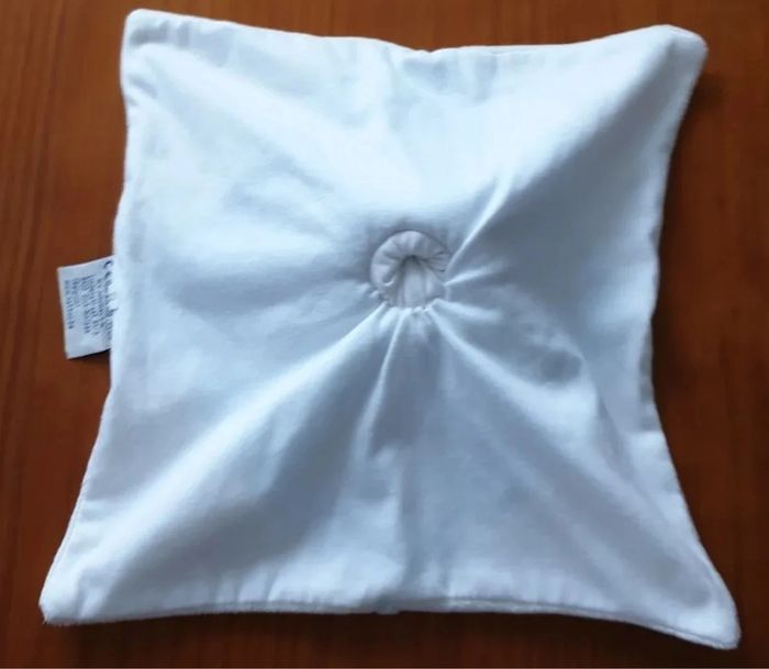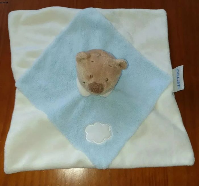 style mouchoir Nattou Blanc bleu marron Nuage Plat carré Col blanc Petit trou en dessous pour mettre le doigt et faire marionnette Gilles
