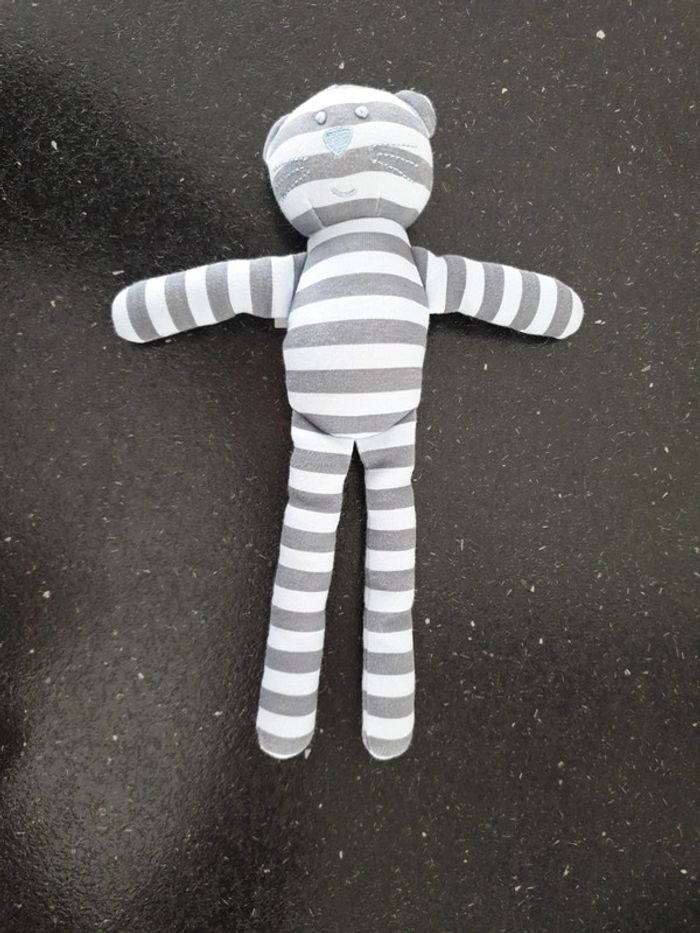 Environ 30 cm de hauteur pour ce doudou Monoprix jamais utilisé couleur bleu gris tissu jersey ours les yeux le nez la bouche les moustaches sont brodés motif rayé