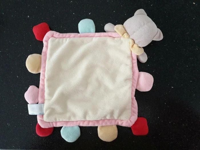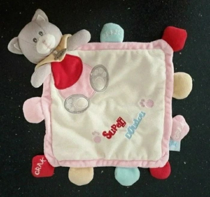 Brodé super doudou avec des empreintes de pattes 🐾 couleur beige rose rouge bleu ciel jaune clair grelot hochet dans la tête bruit de papier froissé crak