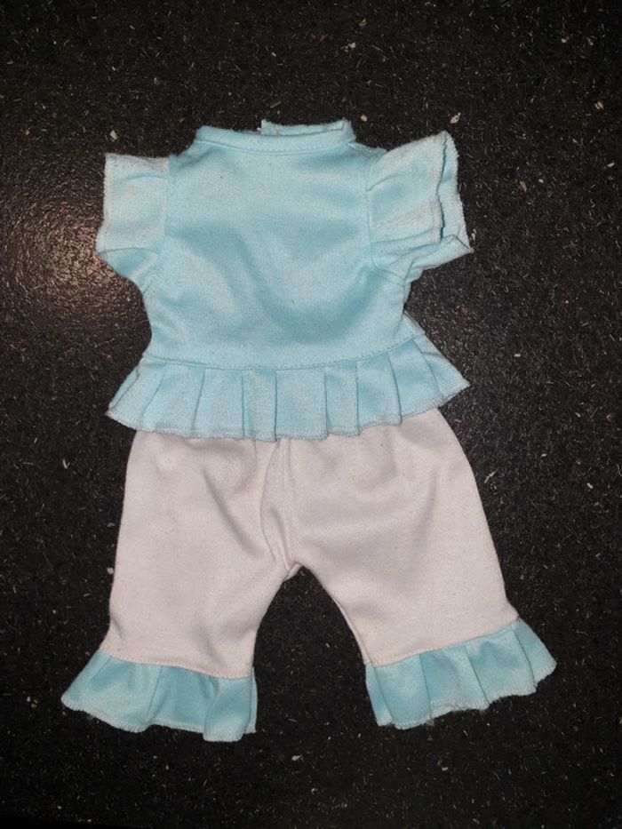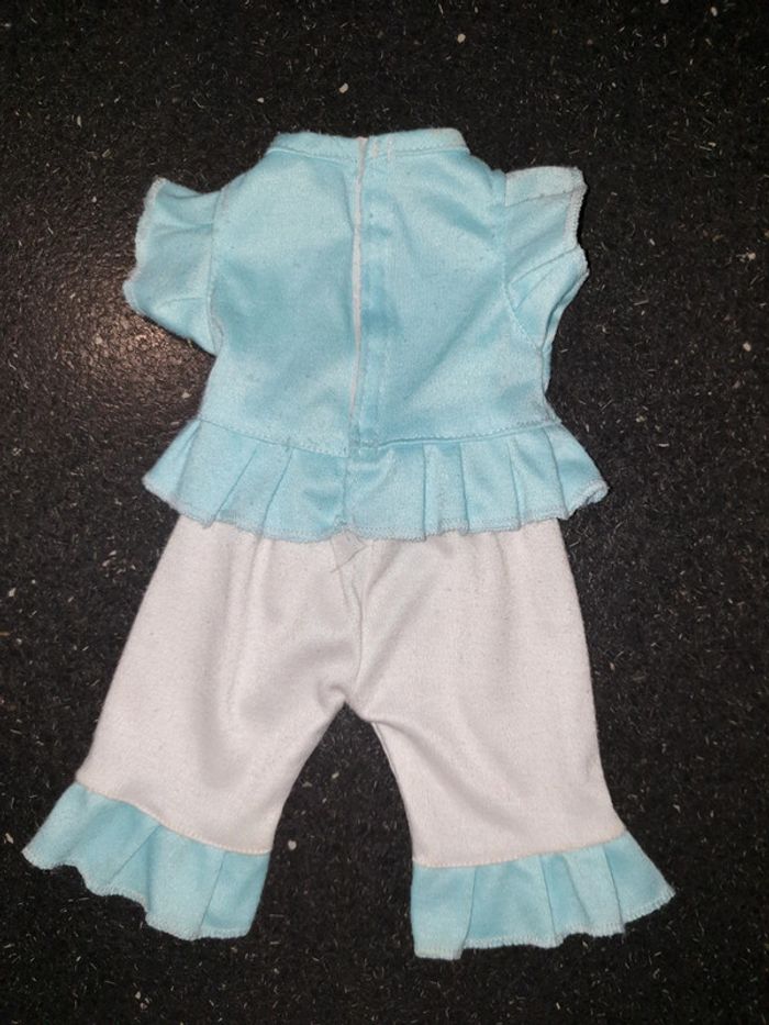 Un haut volanté bleu turquoise fermeture scratch dans le dos Un pantalon blanc et bleu assorti taille élastiquée En très bon état l'arrière est un peu peluché