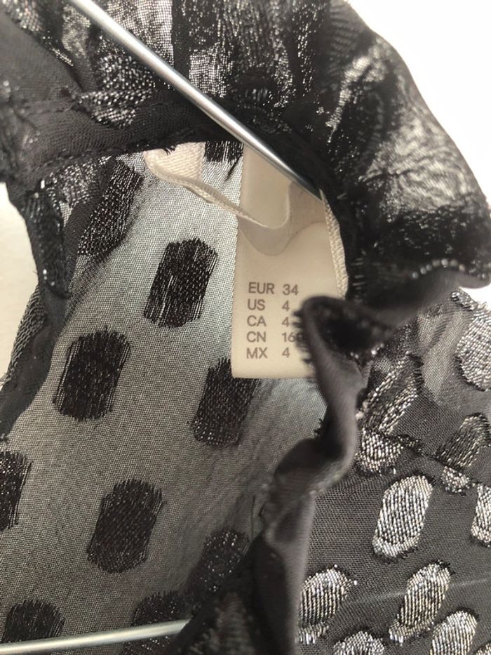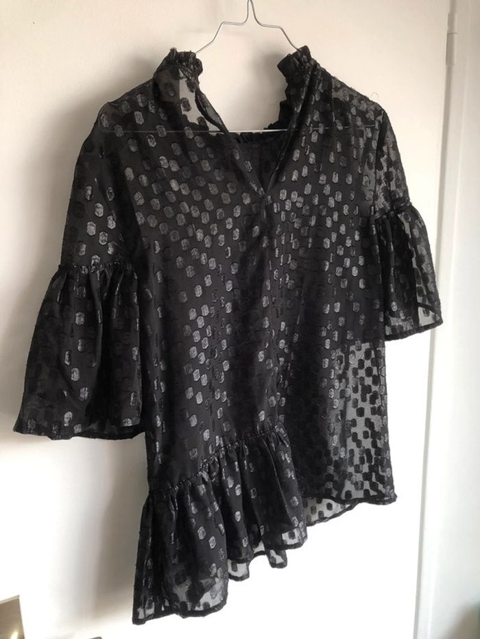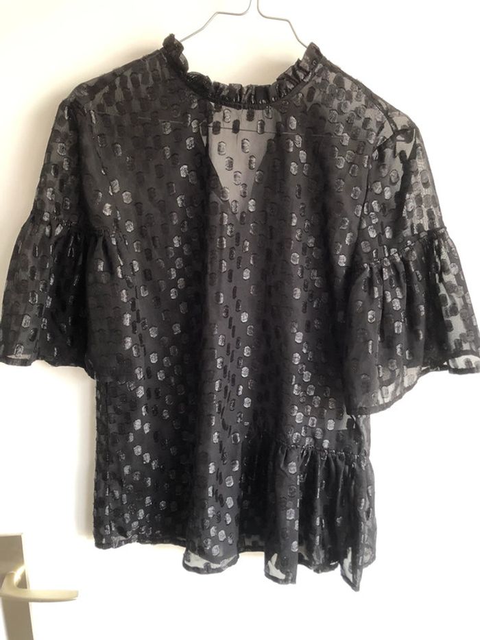Manches bouffantes Matière noire et voilage tachetée Très chic et élégante. Structure le buste Acheté 59€