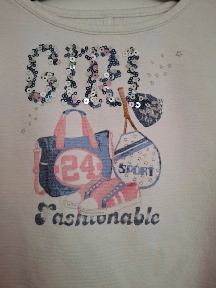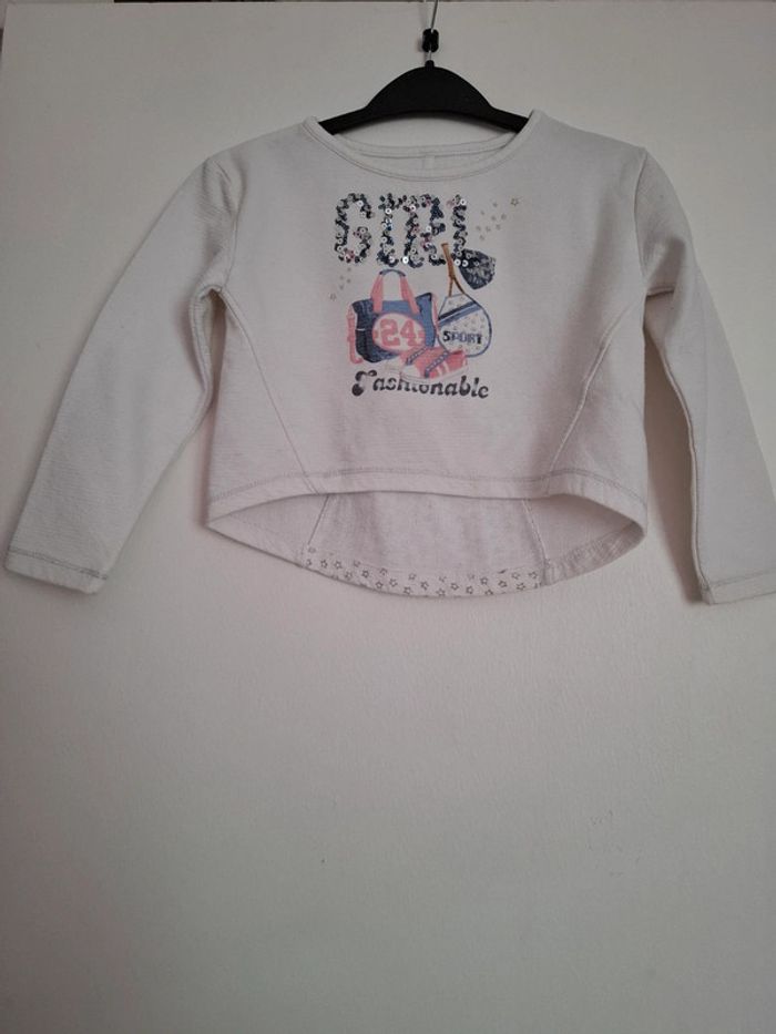 Haut court de couleur blanc Dessins avec sequins en parfait état Ma fille le mettait avec un débardeur, car le haut est court devant. Possible de le mettre avec un tee shirt à manches longues. La matière est assez épaisse Taille 5ans 110cm En excellent état #Mesventescinqansfille