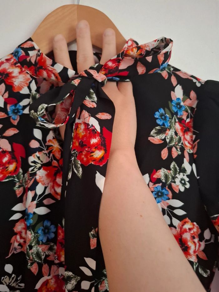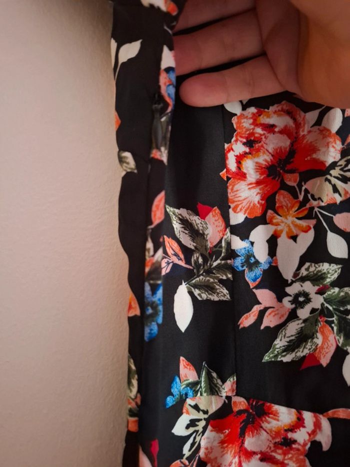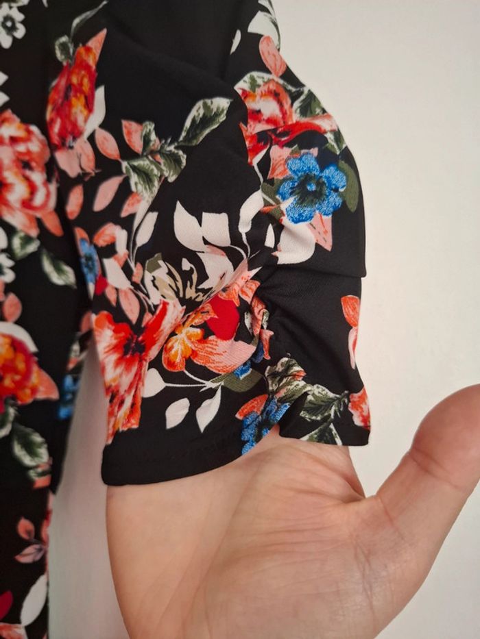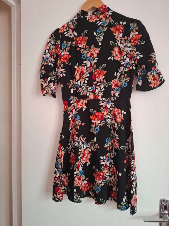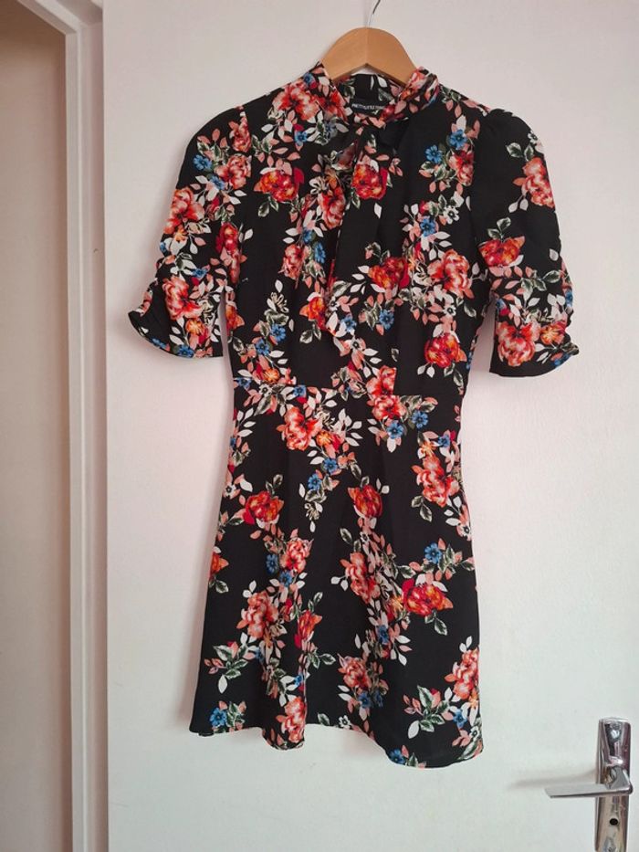 Très belle robe noir fleuris Matière très légère Noeud sur le devant Cintré Fermeture invisible sur le côté gauche Taille 32 #Mesventesquatorzeans #MesventesfemmeXXS