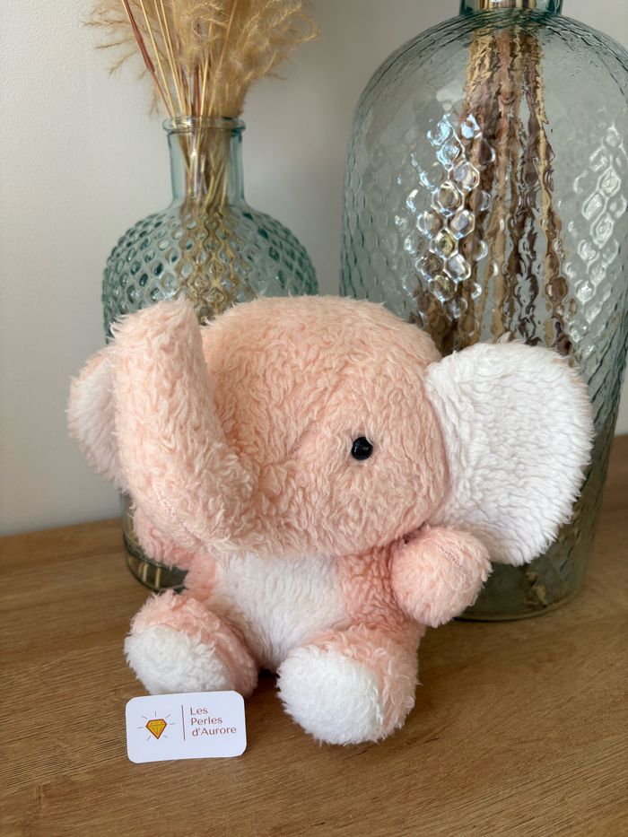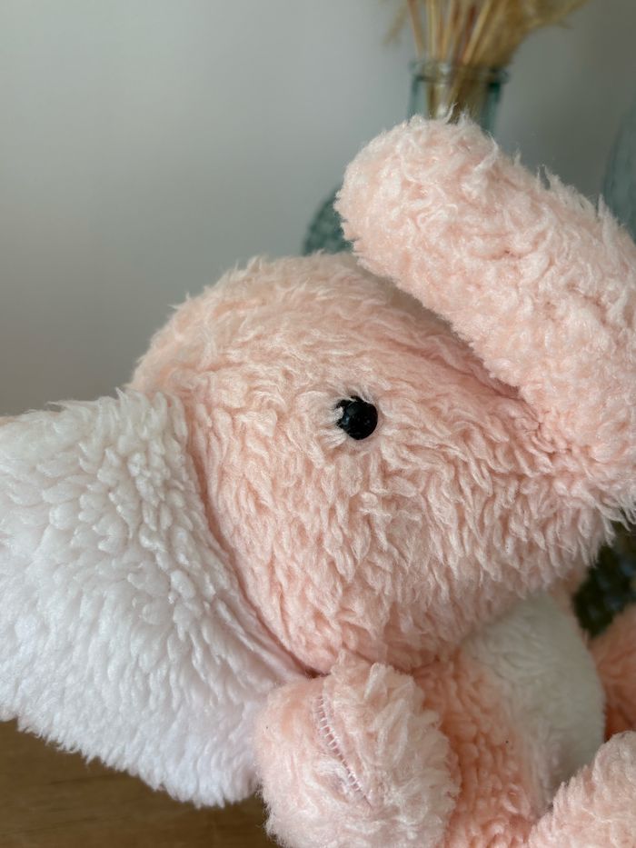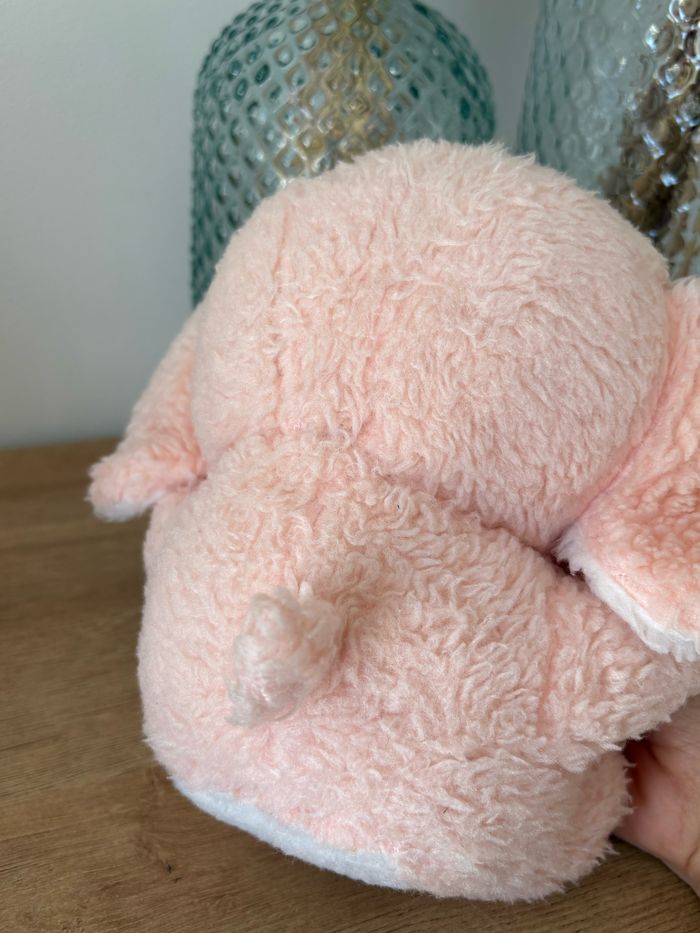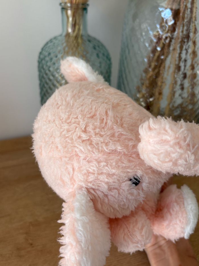 Peluche vintage Ajena Éléphant rose Bruit de hochet / grelots Les yeux sont en plastique noir (quelques traces d'usures) Hauteur : environ 20 cm Réf : C8
