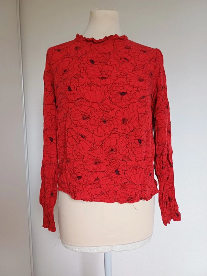 Blouse rouge à fleurs, col volanté - photo numéro 1