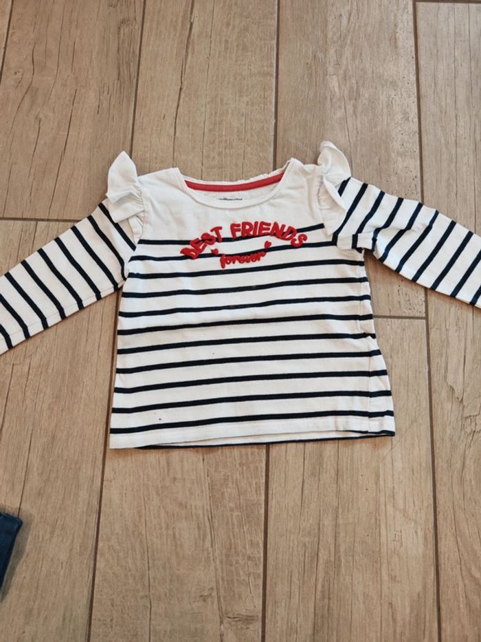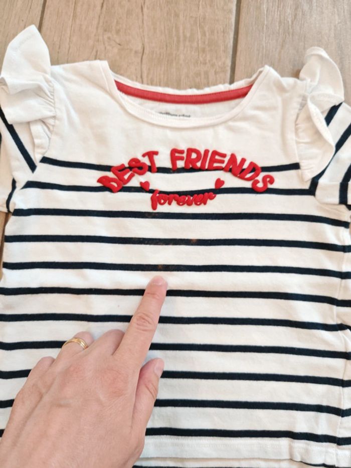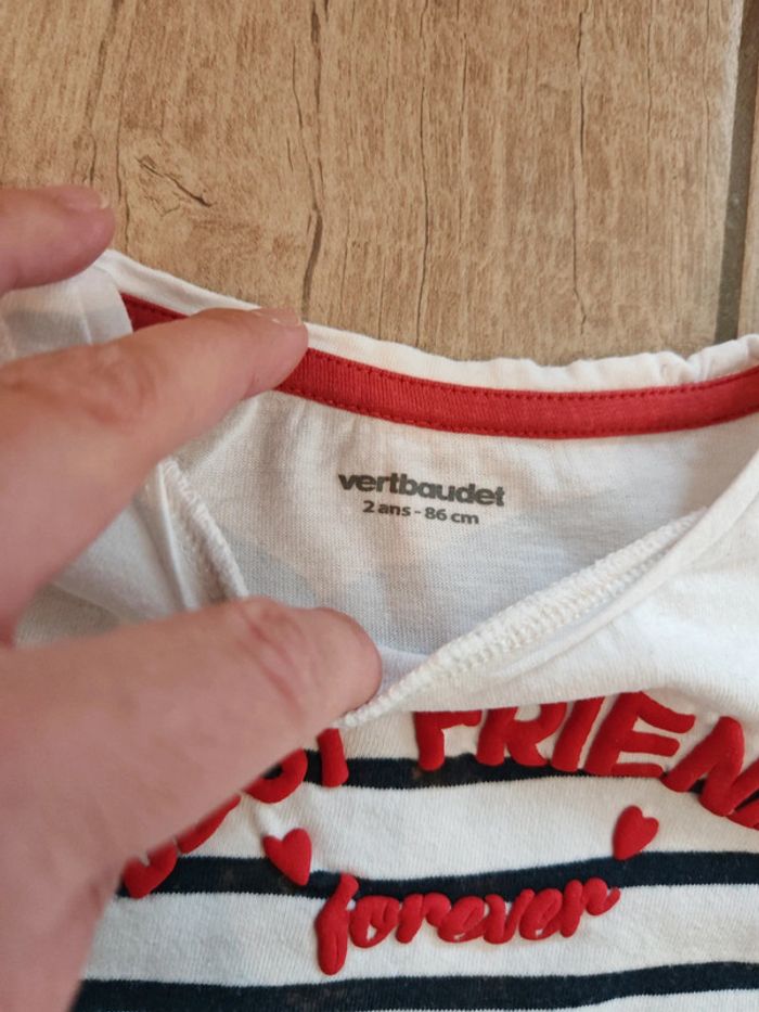 Ensemble fille en 2 ans composé de : ☀️ Un jegging Kiabi ☀️. Un t-shirt manches longues bleu et rouge "best friends forever" Verbaudet ⚠️ voir photo trace de décoloration