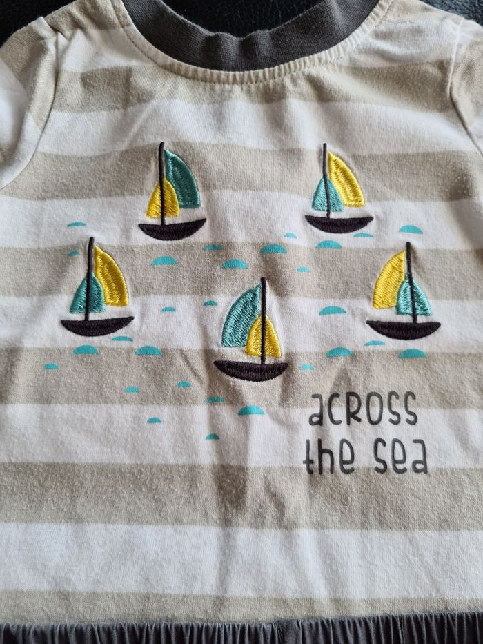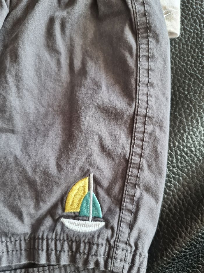 Bermuda taille élastique avec motif voile Tee-shirt à rayures blanches et beiges motifs bateaux . Boutons sur l arrière pour enfilage facile. #sabifay_garçon12mois