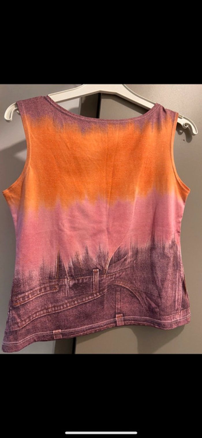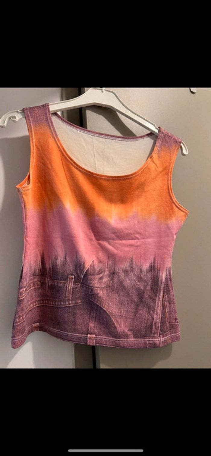 débardeur court imprimé denim orange et rose très bon état #croptop #tshirt #haut #topété #vintage #jean