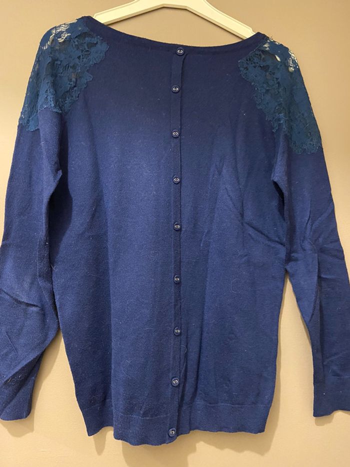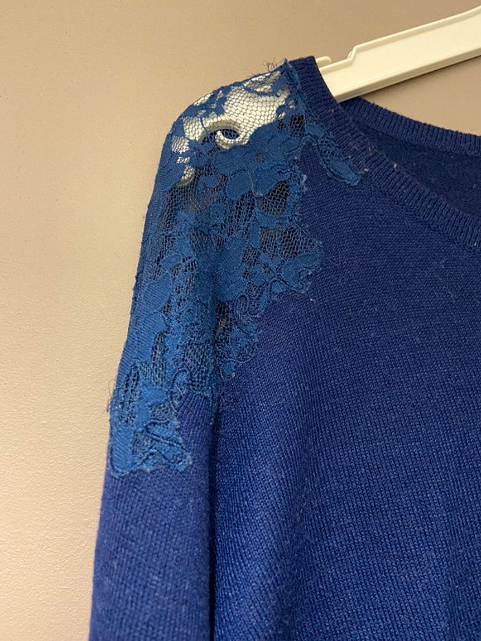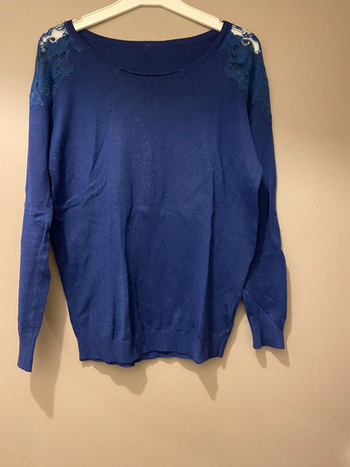 Pull bleu à dentelle aux épaules bon état - petits boutons décoratifs au dos - contient de la laine - taille unique #drapdelaine #manteaulong #manteauneuf #doudoune #veste #robeàfleurs #robejean #chemisejean #chemiselongue #pullneuf #robeprintemps #robehiver #robeete #tunique #robeautomne #topneuf #pullhiver #pullneuf #robepull #madeinfrance #topneuf #pullhiver #pullneuf #doudounelongue #topchic #pullcolv #drapdelaine #bonnet #robelongue #pullhiver #pullsexy #caban #trenchcoat #vesteloose #oversize #manteauchic #blousonlong #giletchaud #vestelongue #manteaucarreaux #blousonchaud #manteauvintage #manteaucamel #zara #tunique