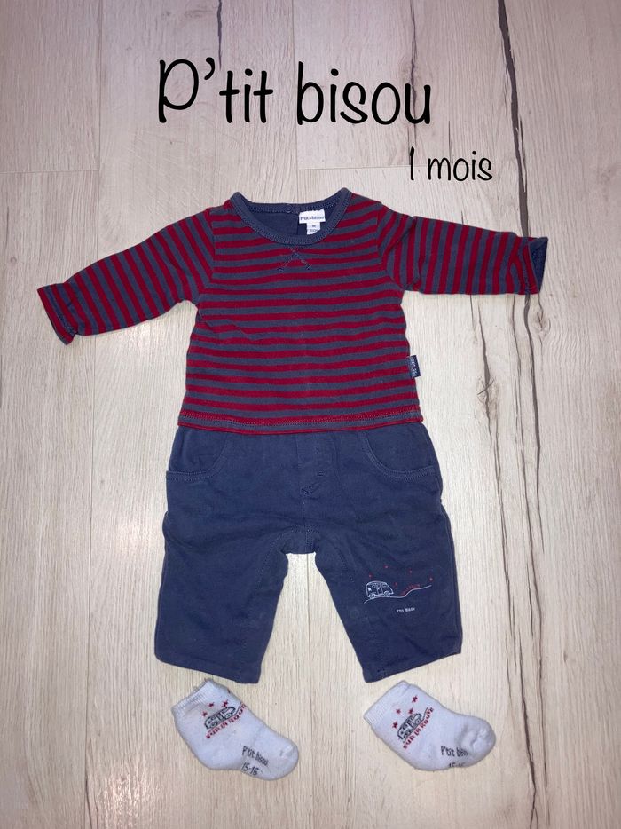 Ensemble P’tit Bisou Grenouillère avec chaussettes Bleu/rouge rayé 1 Mois Très bon état