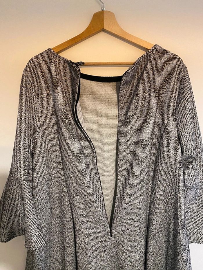 Nederlands : jurk, zwart en wit, uitlopende mouwen, American Living, maat US 18 / EU 48.