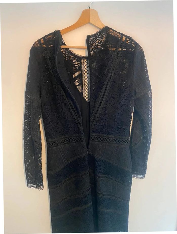 Español : Elegante vestido de encaje negro de The Kooples, mangas largas, forro en el cuerpo, largo hasta la rodilla, talla M, nuevo con etiqueta.