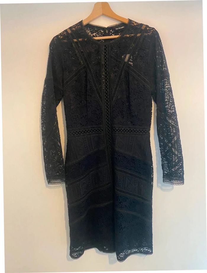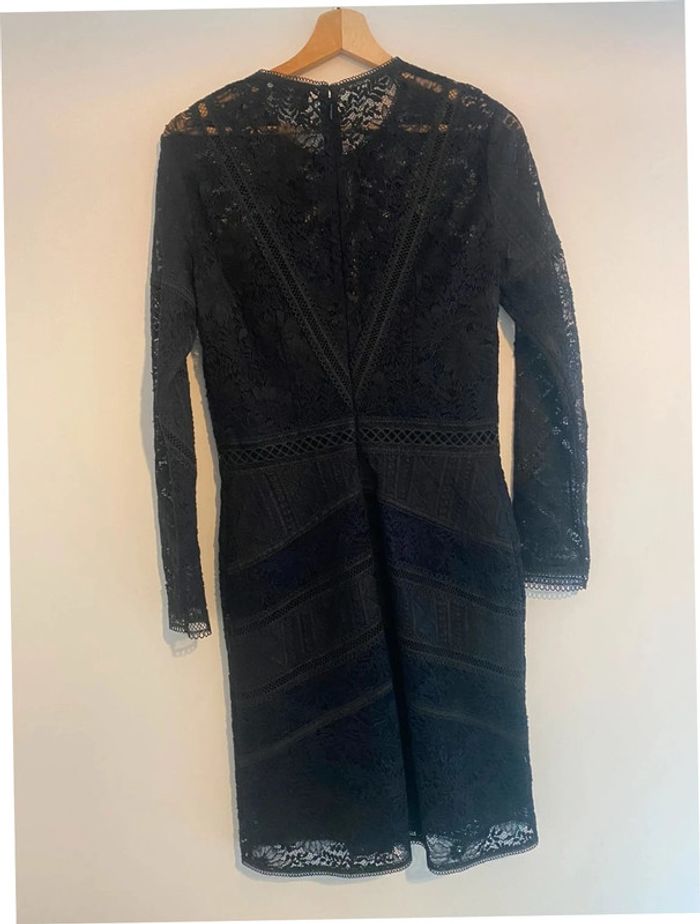 Nederlands : Elegante zwarte kanten jurk van The Kooples, lange mouwen, gevoerd op het lichaam, knielang, maat M, nieuw met label.