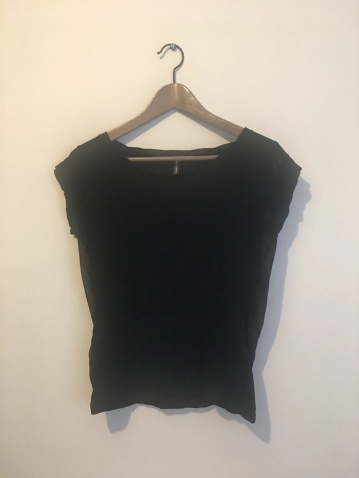 T-shirt loose noir de la marque Naf Naf, porté quelques fois mais en excellent état. Taille XS. Effet transparent sur les côtés + petit liseré en voile transparent au col. 45% coton 45% modal 10% polyester