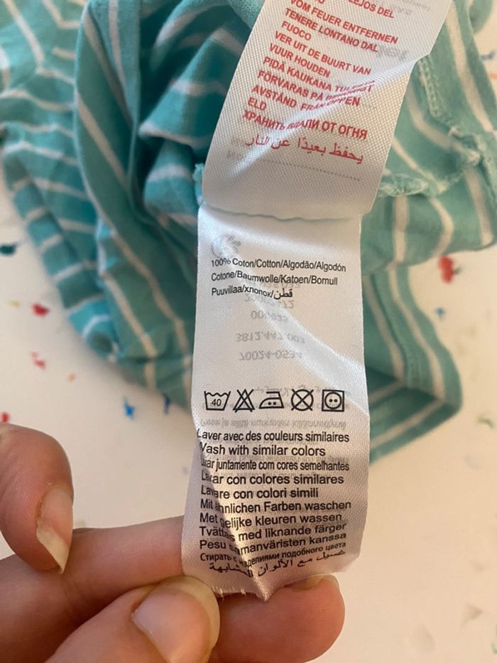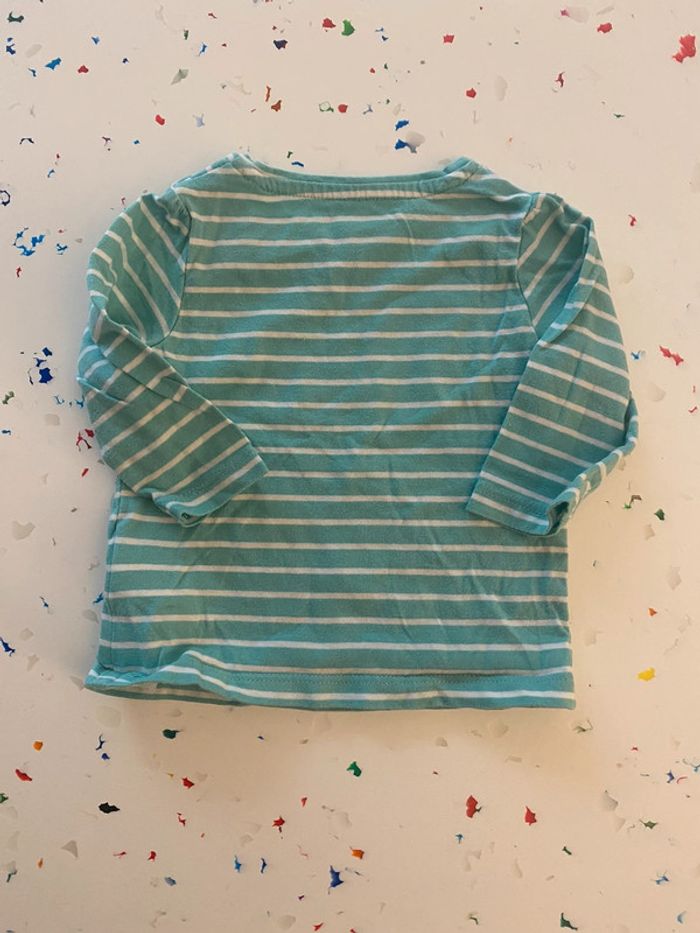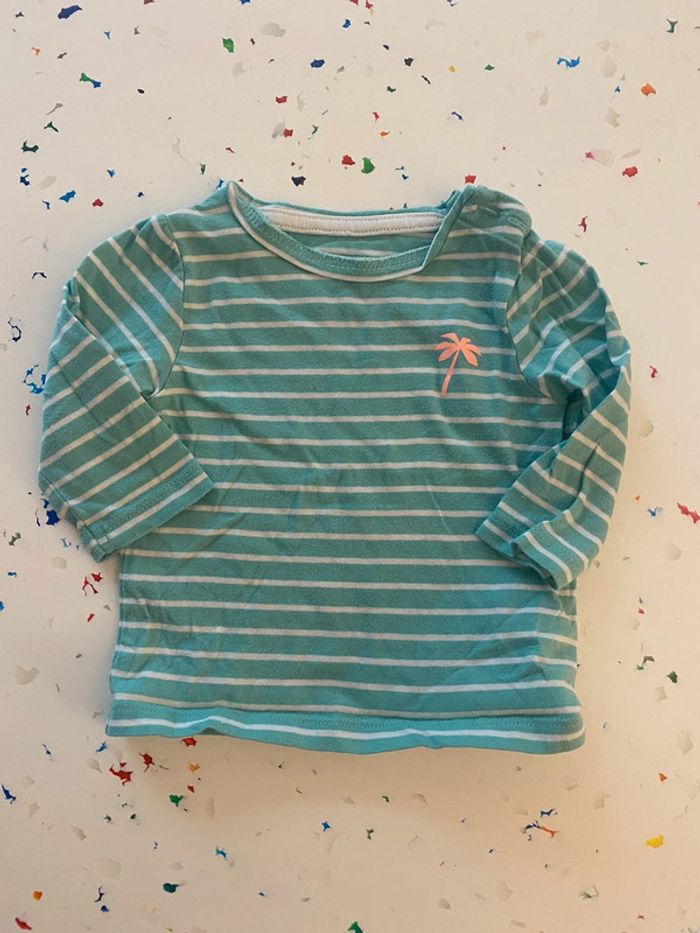 T-shirt manches longues de la marque Vert Baudet Taille 3 mois / 60 cm Très bon état il n’a été porté que 2 fois Rayures vertes et blanches avec un joli petit palmier corail Unisexe