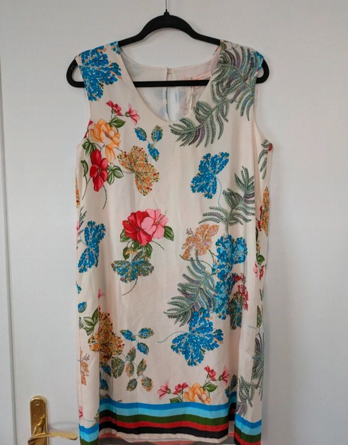 Magnifique robe sans manches Coupe droite légèrement évasée dans le bas Joli imprimé floral avec bandes de couleurs a l'horizontale dans le bas Petit décolleté en V et ouverture goutte dans le dos 100% polyester #laféemaraboutée #flowerdress #laféemaraboutéeaddict #dressaddict