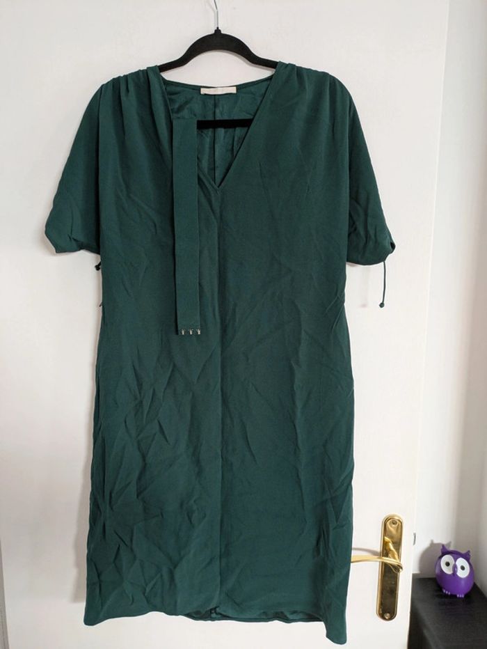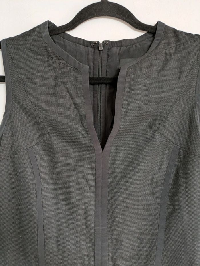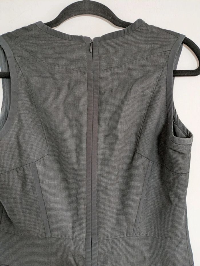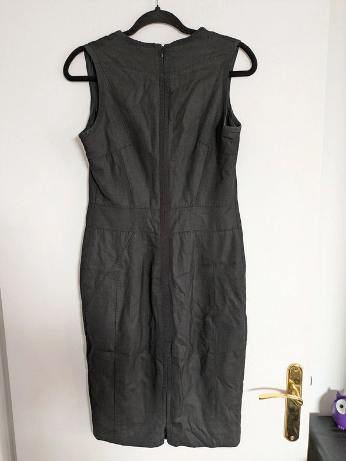 Magnfiique robe avec une coupe droite et une longueur en dessous du genou. Sans manches avec un joli décolleté et une fermeture éclair qui va de la nuque jusqu'en bas 100% en laine vierge Doublure 100% soie Prix d'origine : 700 euros taille 38