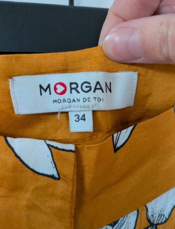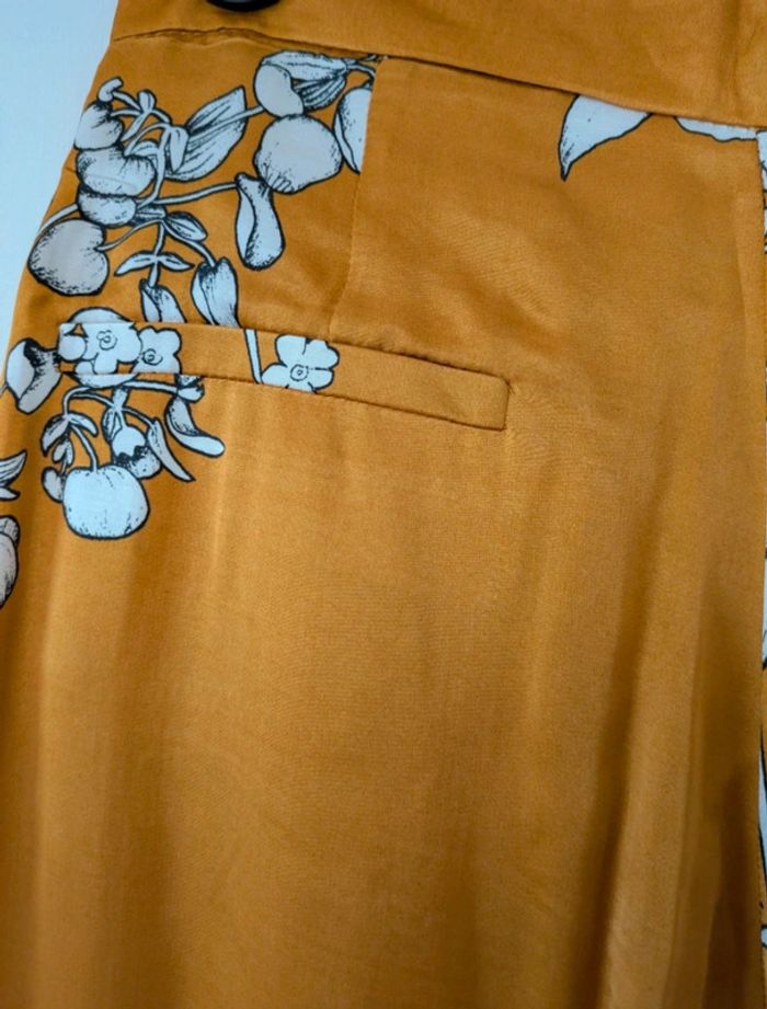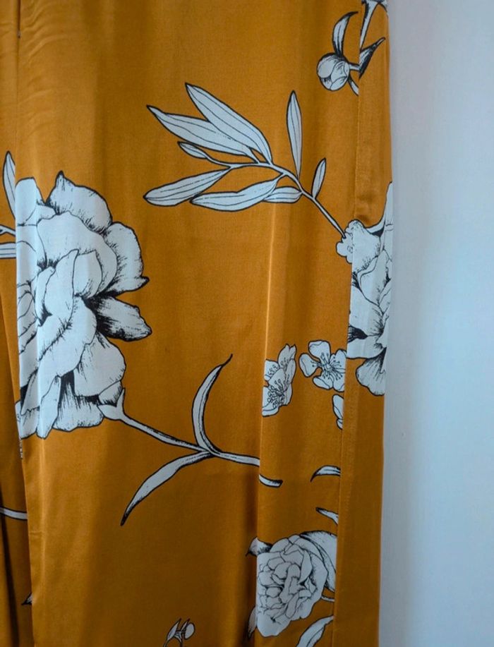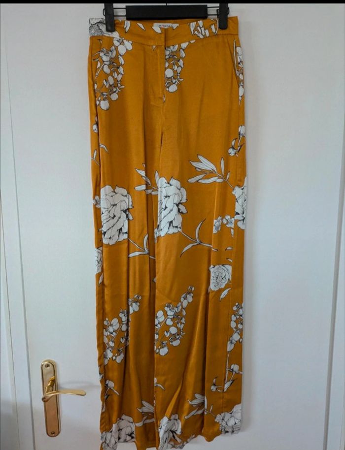 Magnifique pantalon a jambes larges En matière satinée et fluide Imprimé floral dans les tons blancs et ocres Taille haute Parfait pour les beaux jours qui arrivent! #pantswoman #flowerprint #morgandetoi #morganaddict