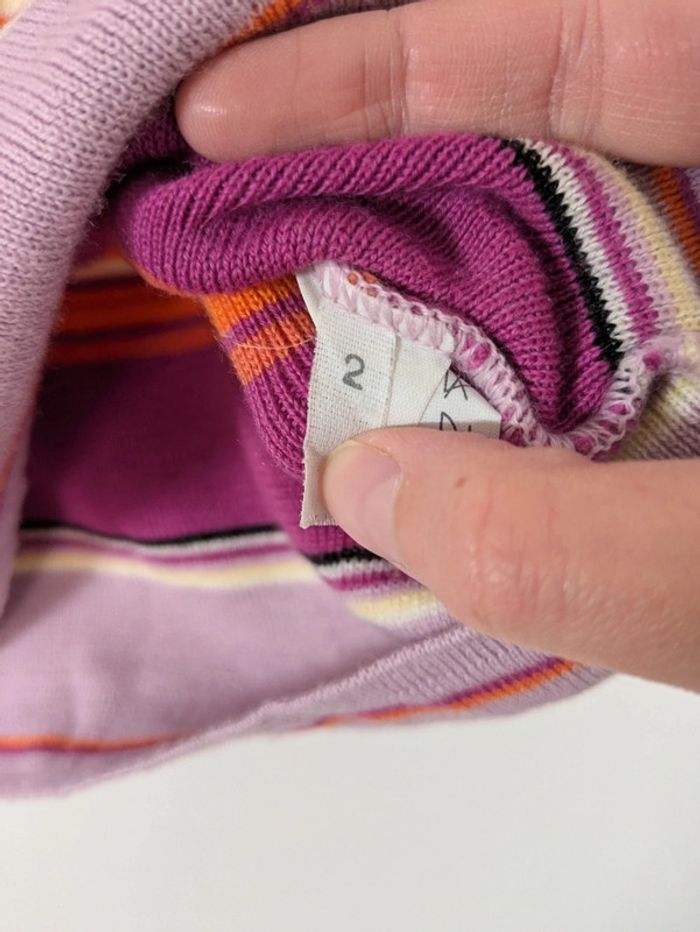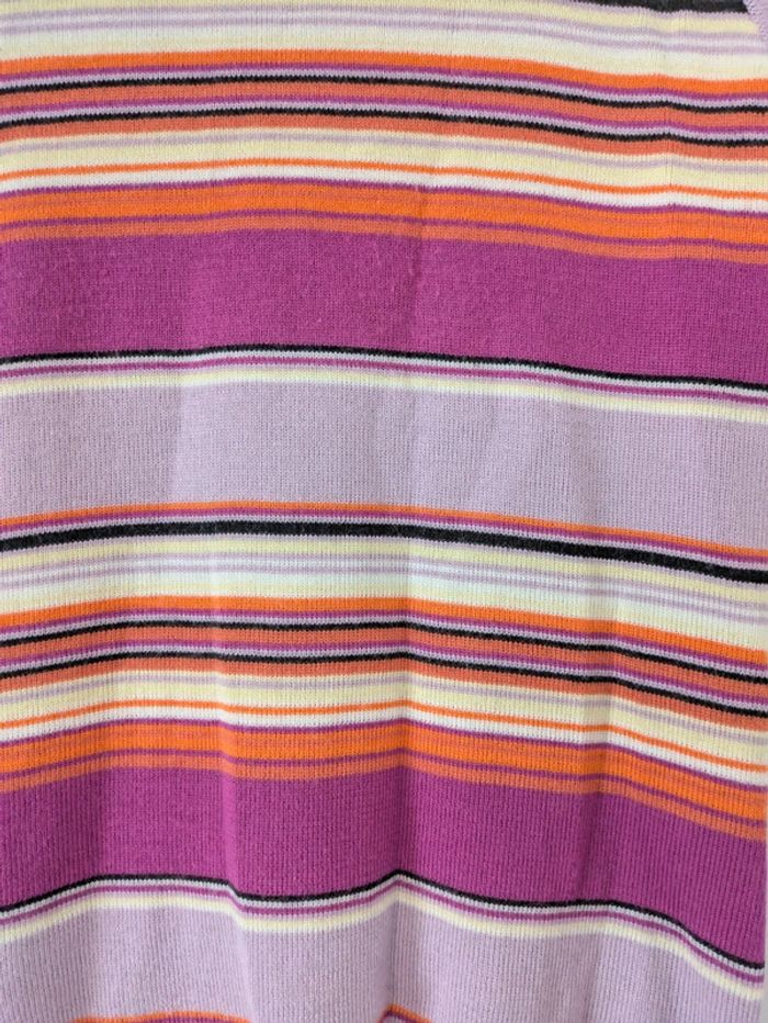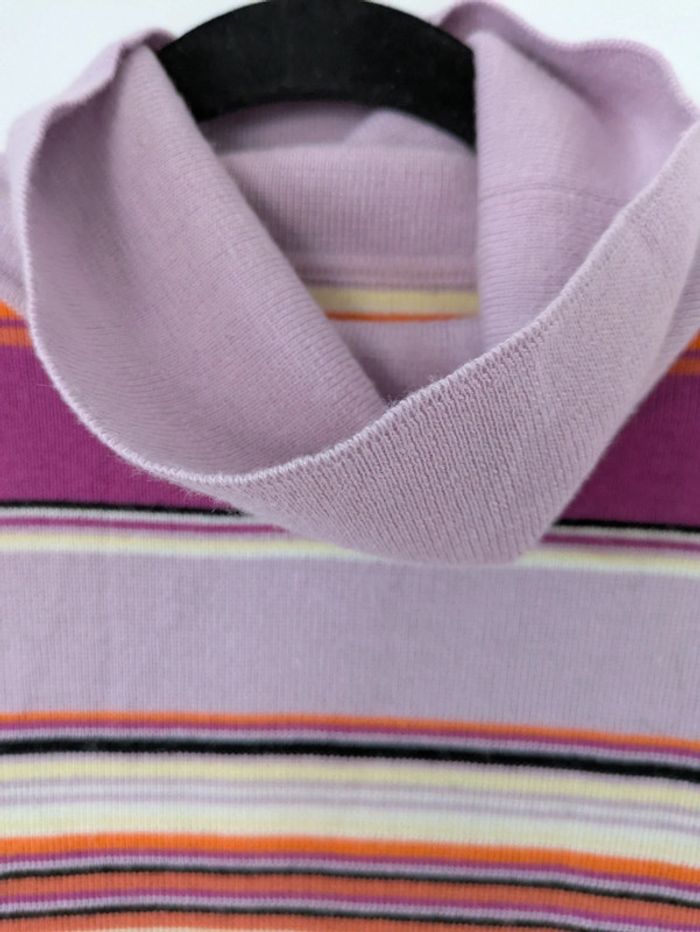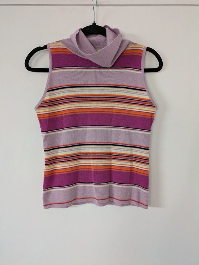 Magnifique pull a maille fine Matière super douce avec de la laine de mérinos Sans manches avec un col roulé Rayures horizontales dans les tons roses/oranges Acheté dans une boutique vintage