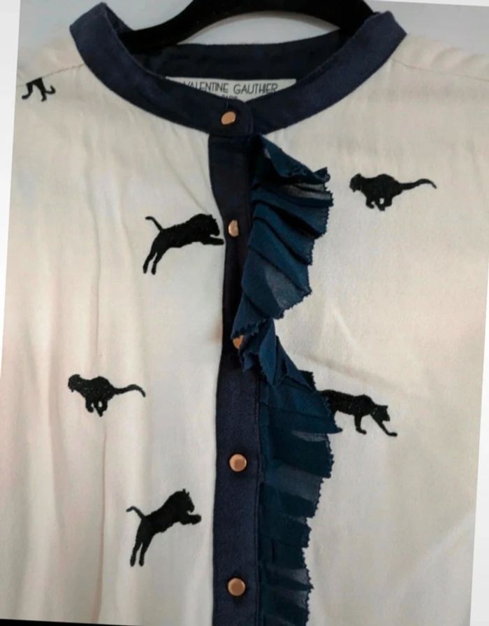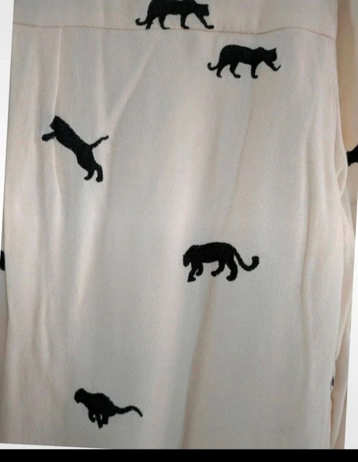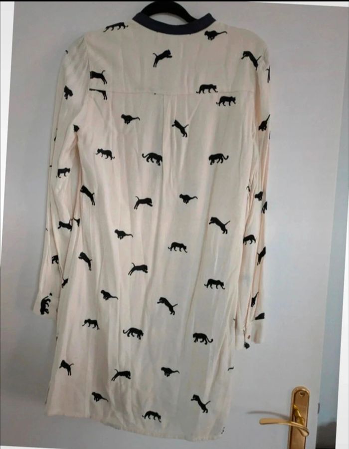Magnifique robe chemise Originale avec une forme plutôt droite mais fluide Imprimé panthères noires Joli décolleté avec volants et boutons dorés Prix de base : 170 euros