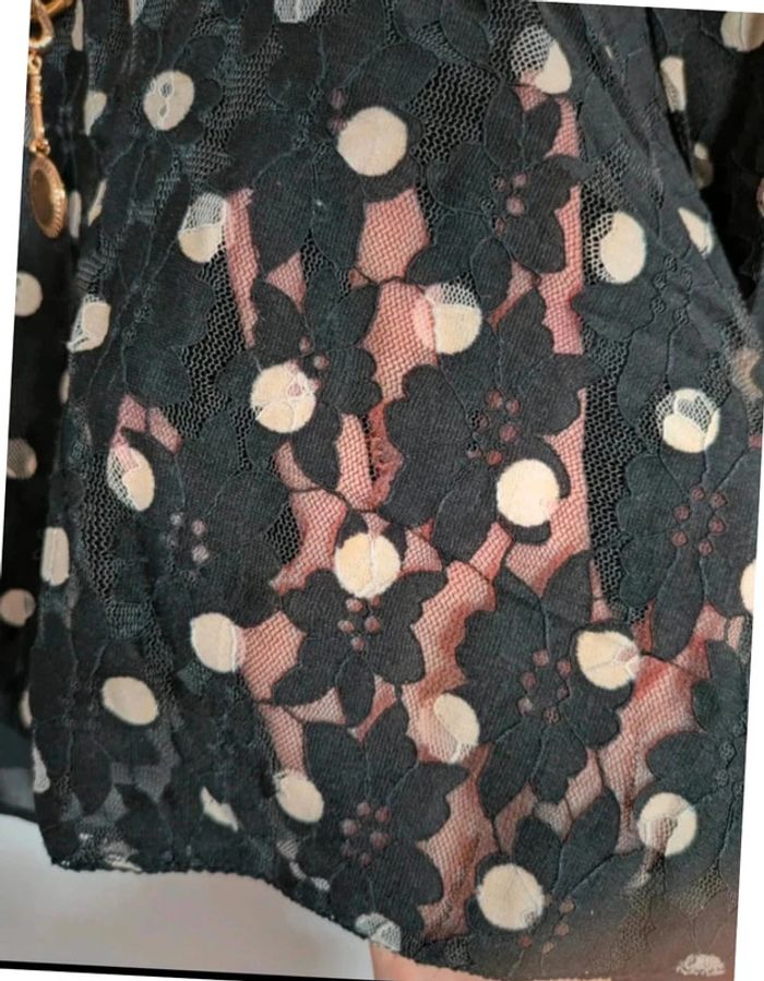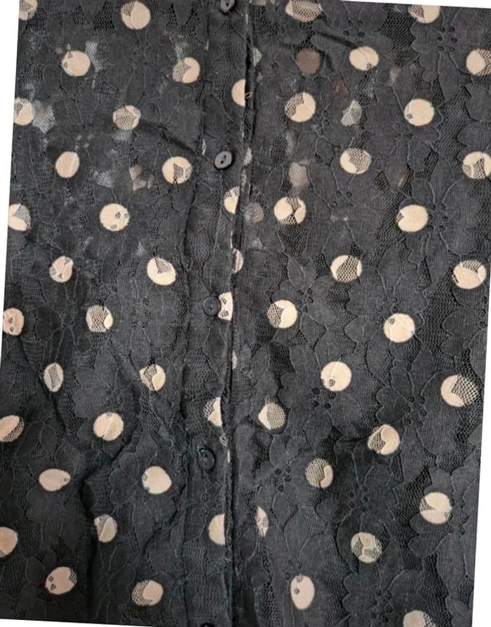 Magnifique blouse fluide Imprimé pois blancs avec de la dentelle transparente. Boutons tout le long du dos Doublure en dessous Demandez pour des photos portées