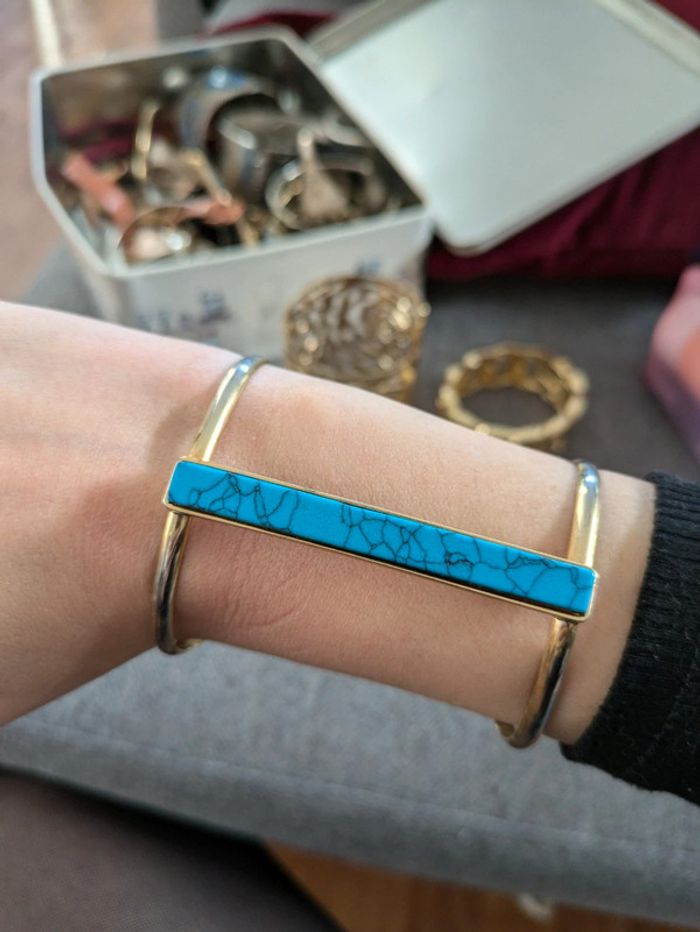 Magnifiques manchettes Une très longue travaillée réglable dorée Une également longue avec une pierre turquoise et réglable Possibilité de les vendre séparément
