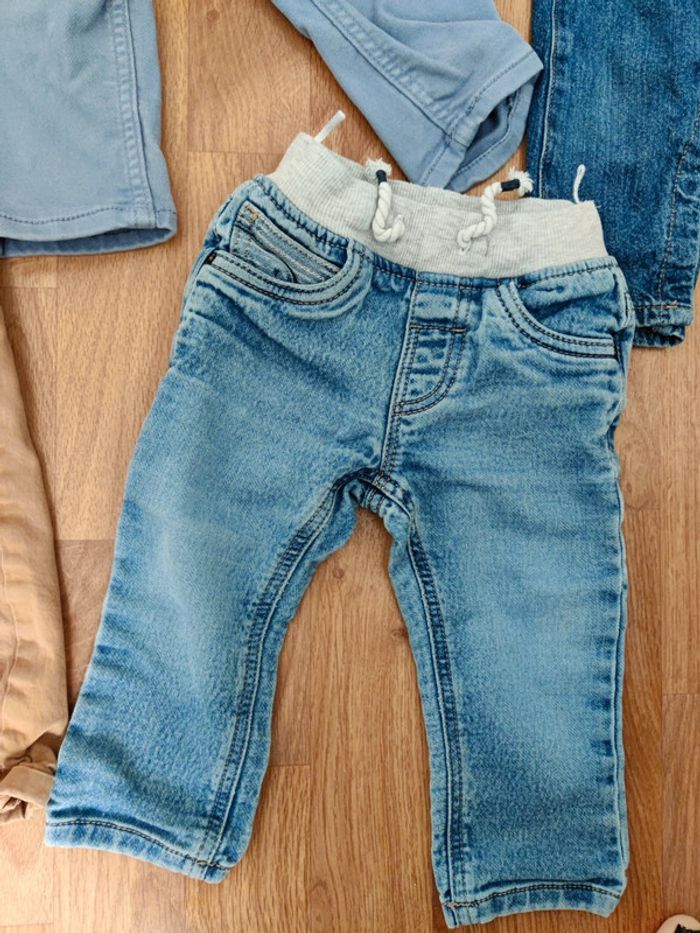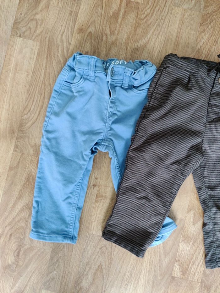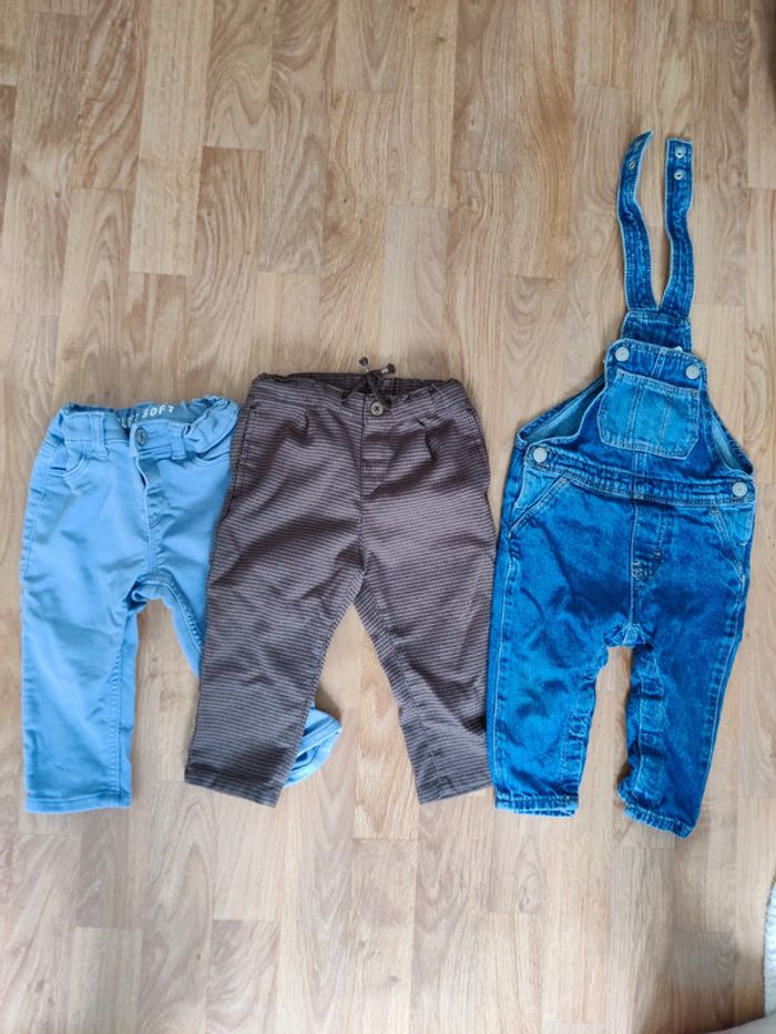 Lots de 5 pantalons /salopette 1salopette en jean en taille 80 cm de chez h&m 2 pantalons en taille 80 cm de chez h&m ,(Chino bleu clair et pantalon fluide imprimé carreaux) 2 pantalons de chez Kiabi en taille 12 mois (un Chino beige et un jean taille élastique)