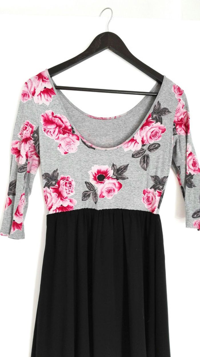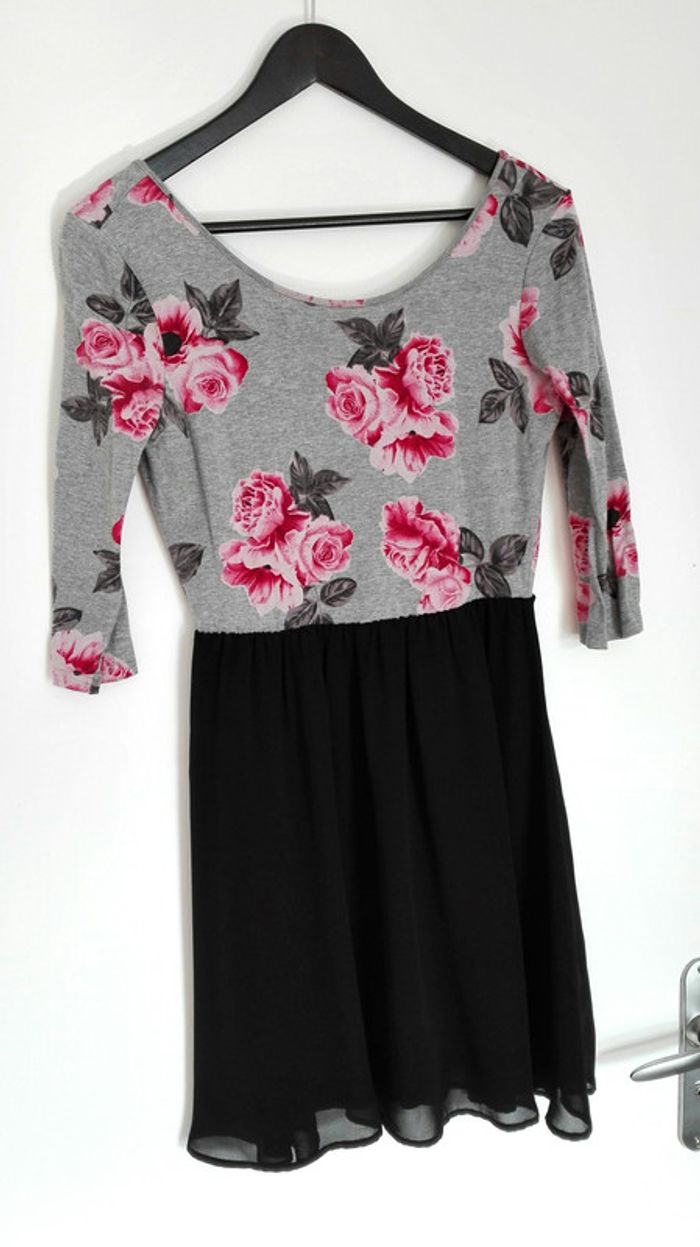 Magnifique robe bi matière. Jupes en voile noir doublé. Haut en coton motif floral, joli décolleté arrondi dans le dos. Parfaite pour la mi-saison qui approche! Demandez pour des photos portées!