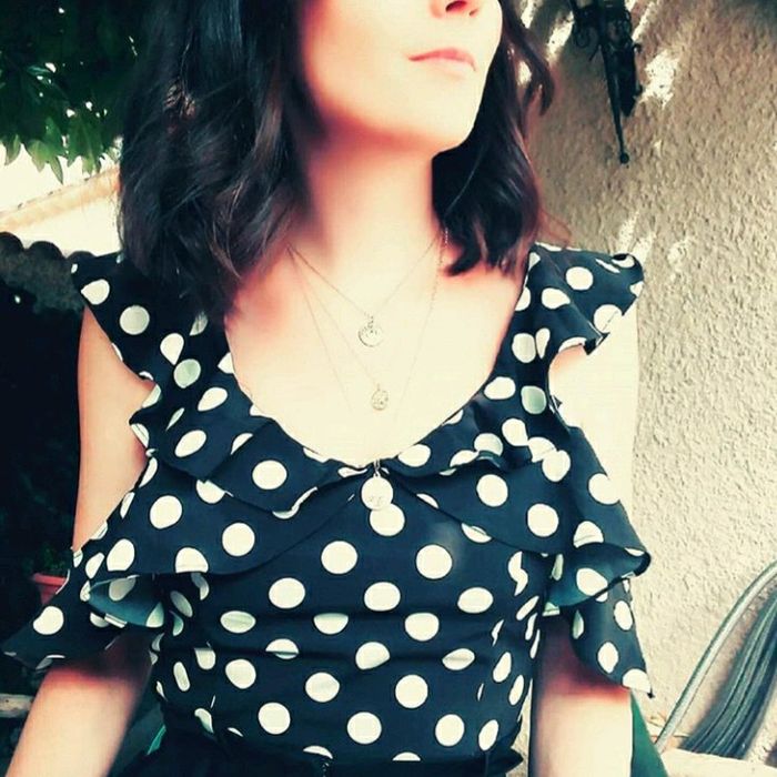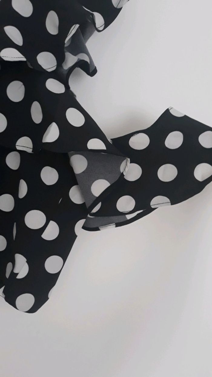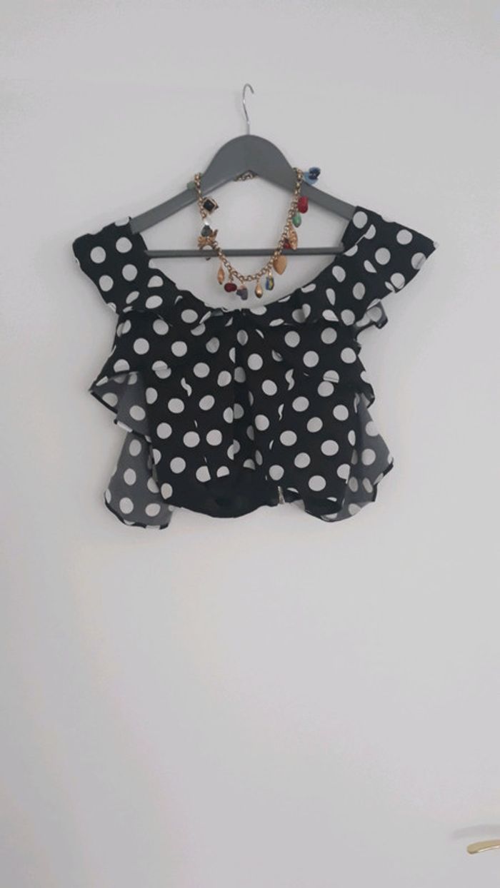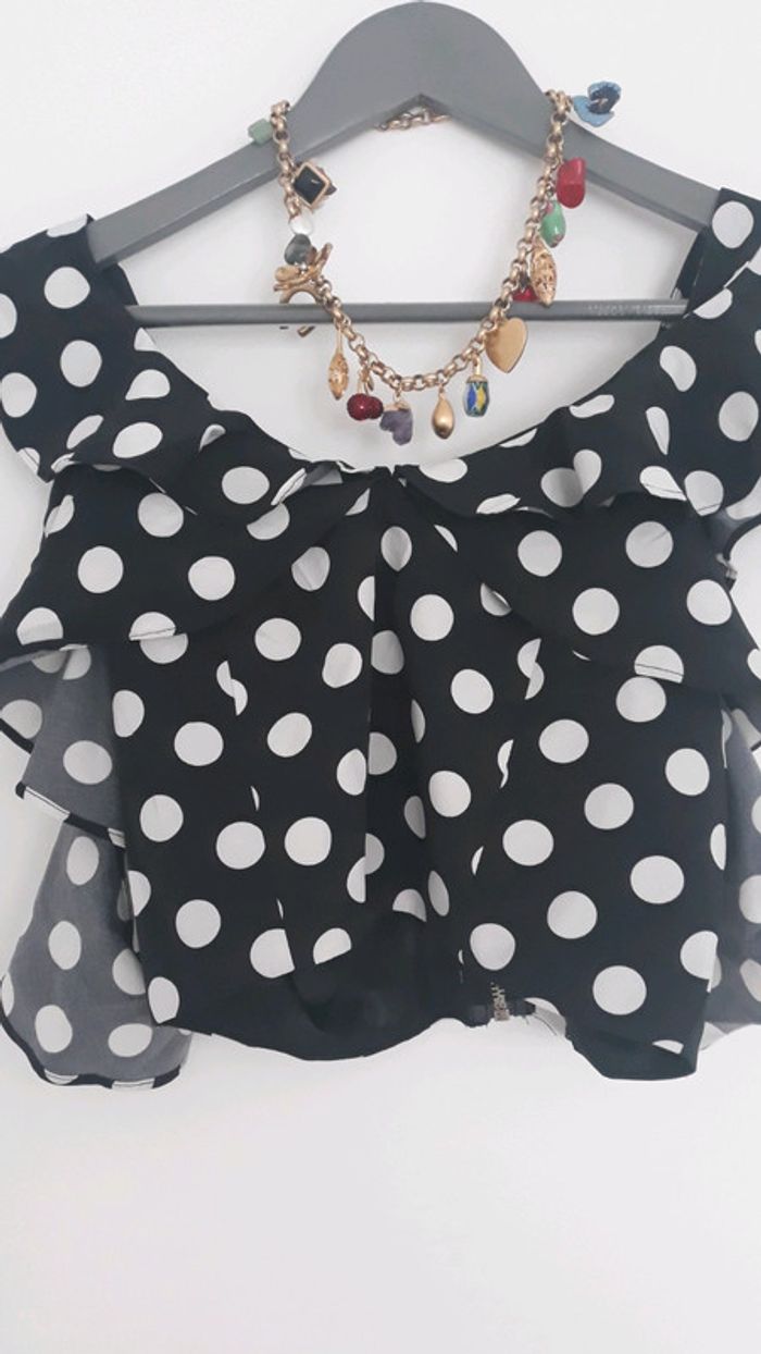 Magnifique top court. Manches volants avec épaules dénudées Imprimé gros pois blancs. Fermeture éclair dans le dos Hyper tendance