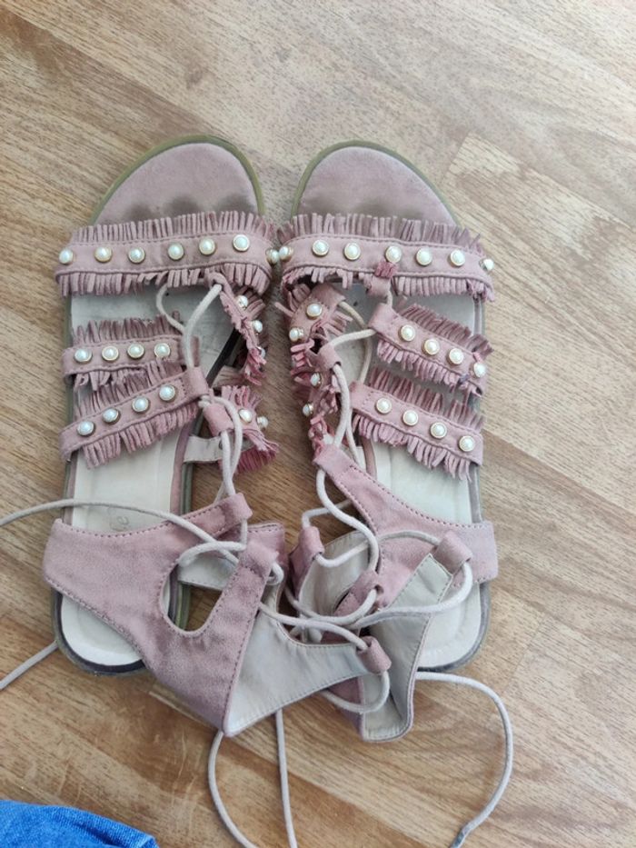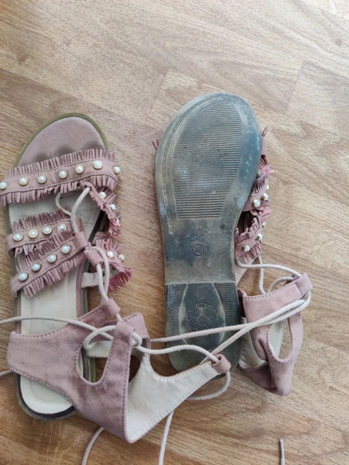 Sandales plates Matière simili daim Fermetures a lacets Petits détails perles et franges Elles ont été bien portées Demandez pour des photos portées