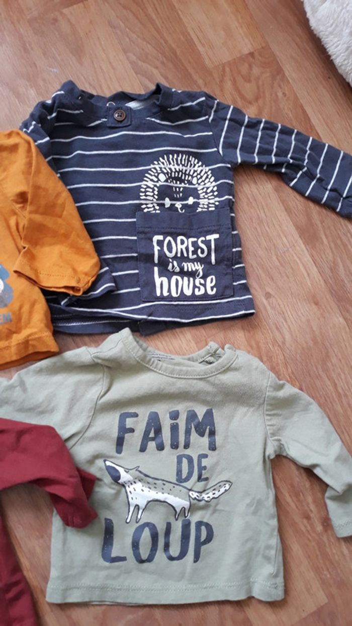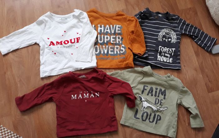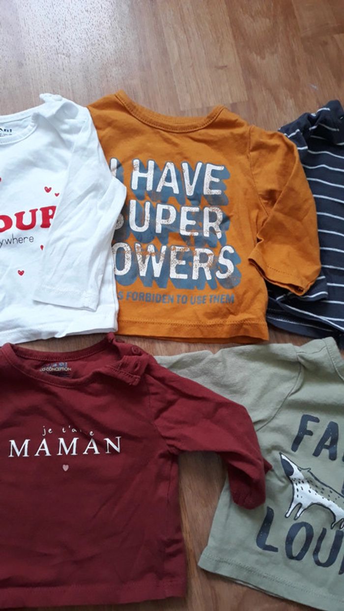 Lot de 5 t-shirts Manches longues Inscriptions sur le devant 1 Bordeaux je t'aime maman 1 blanc AMOUR 1 jaune I have super powers 1 vert faim de loup avec un loup dessiné 1 gris à rayures avec un hérisson Petits boutons sur les épaules pour faciliter l'enfilage 1 mois sur etiquette mais qui peut aller jusqu'à 2 mois facile