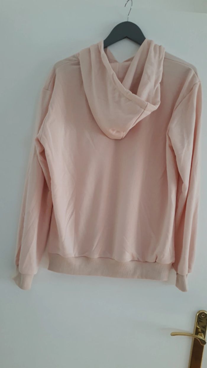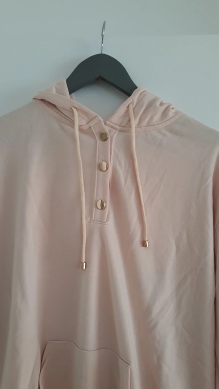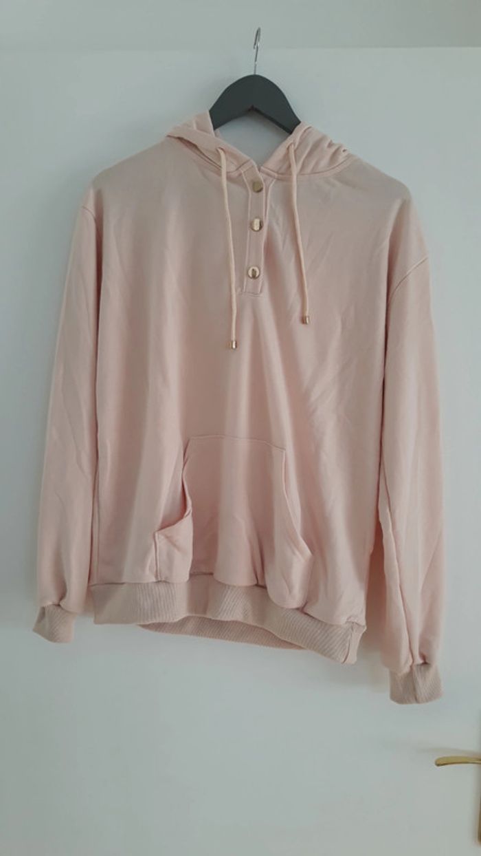 Magnifique sweat / hoodie (à capuche) Légèrement oversize pour une taille M/L Jolie couleur rose pâle. 3 boutons plats dorés sur le devant