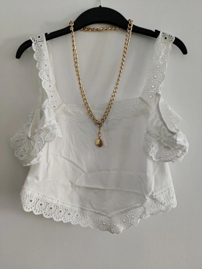 Magnifique top court Épaules dénudées Broderies dans le bas et au niveau des bras Demandez pour des photos portées