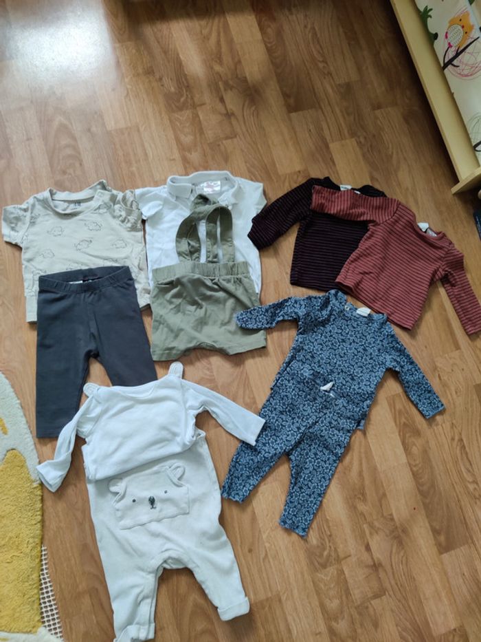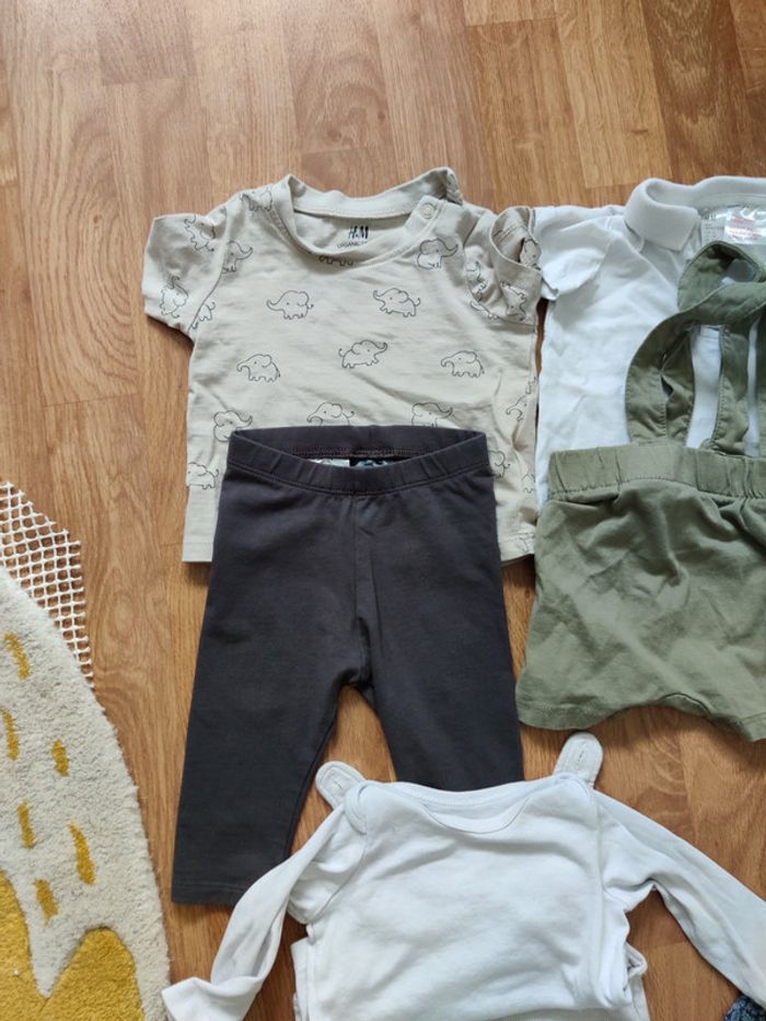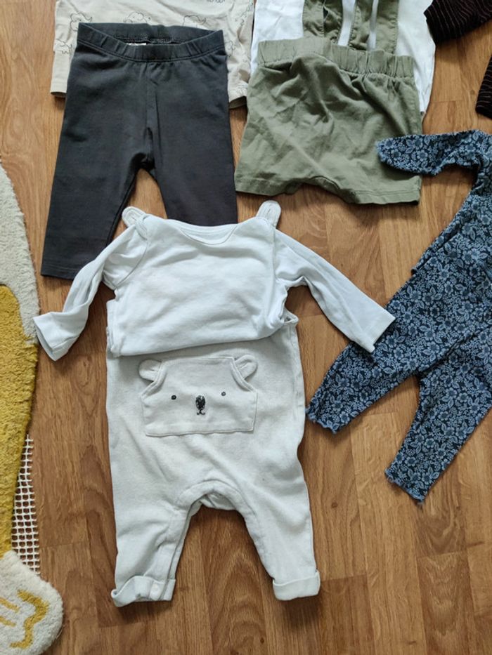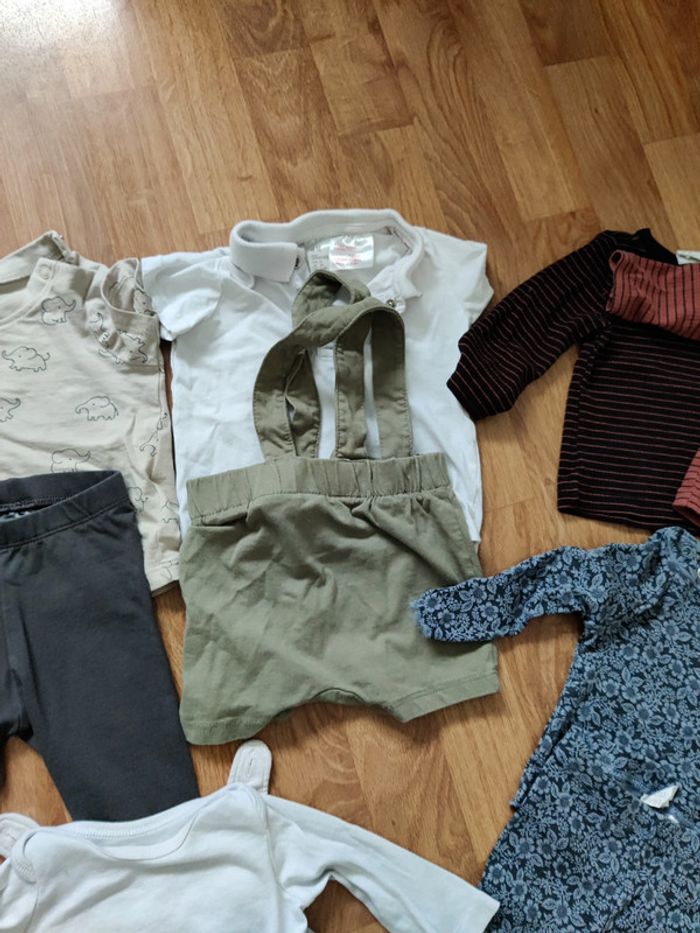 Lot de 4 ensembles 1 ensemble : legging gris foncé et tshirt beige avec motifs éléphants, boutons pressions sur le côté pour faciliter l'essayage Taille 2/4mois , 62 cm. Neuf avec etiquette 1 ensemble : legging bleu imprimé fleur et tshirt bleu imprimé fleurs, boutons pressions pour faciliter l'enfilage Taille 2/4 mois, 62 cm. Neuf avec etiquette 1 ensemble : tshirt a Manches longues blanc et salopette en coton neige avec poche tête d'Ours sur le devant. Boutons pressions a l'entrejambe pour faciliter l'enfilage. Taille 2/4 mois, 62 cm. Neuf sans étiquette 1 ensemble short avec bretelles et petit polo blanc taille 2/4 mois, 62 cm. Neuf sans étiquette 2 hauts côtelés a rayures dans les tons rouille/noir neuf sans étiquette