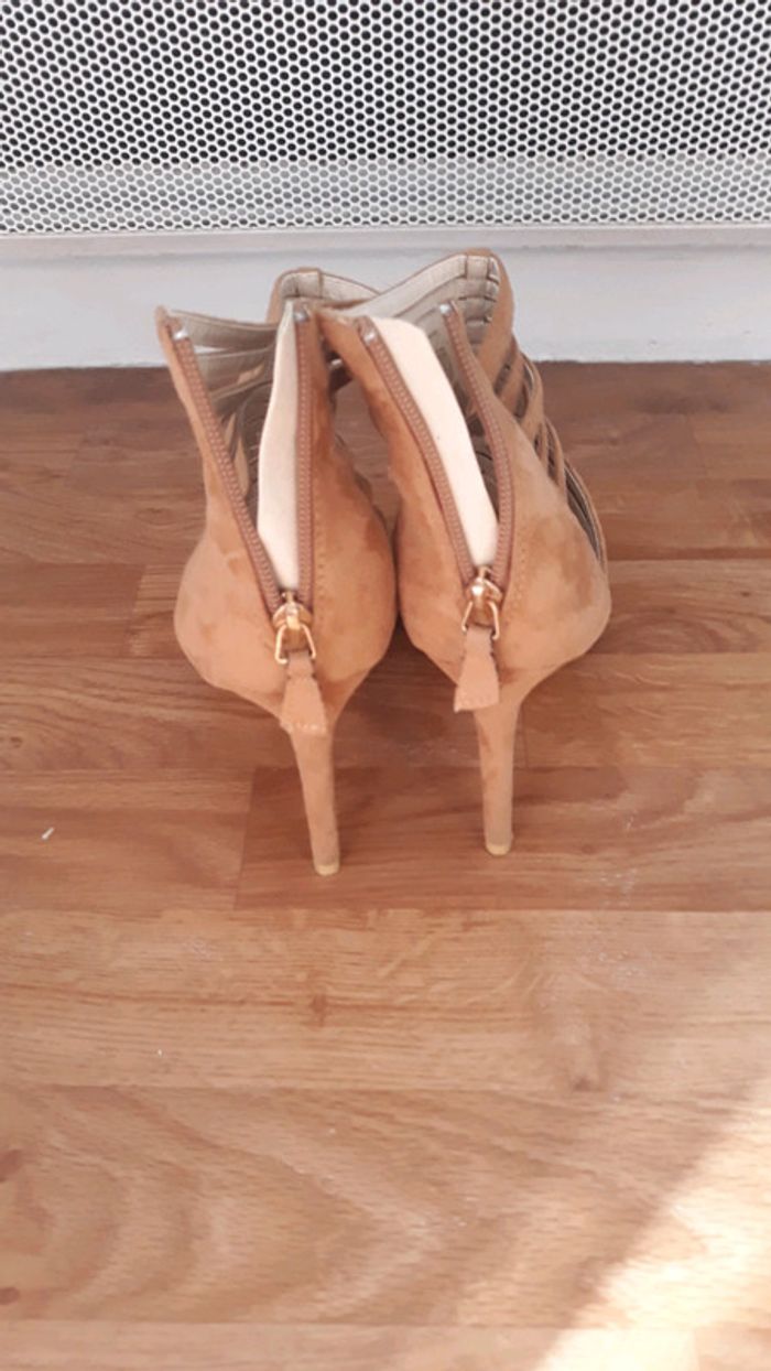 Magnifique paire de sandale Peep toes. Talons aiguilles de 8 cm Fermeture éclair derrière Couleur camel Matière simili daim Super belles à porter et très agréables!