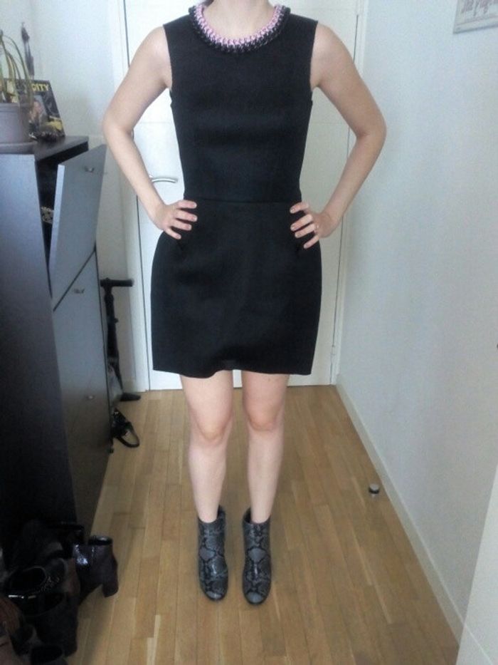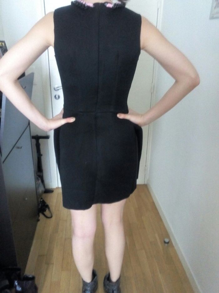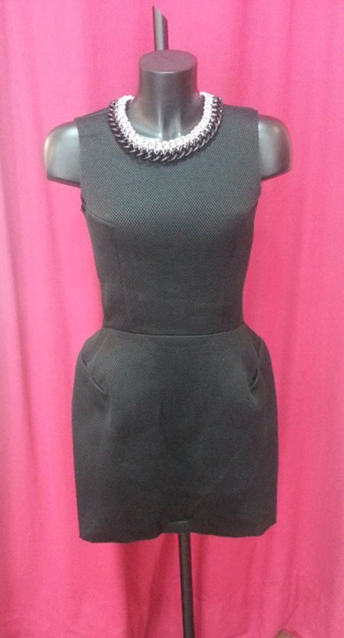 Magnifique robe noire. Sans manches. Matière néoprène très légère. Jupe légèrement arrondie Resserrée à la taille. Collier plastron intégré à la robe. Achetée 50 euros.