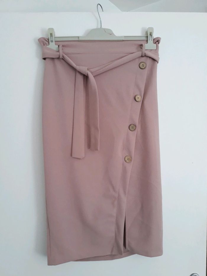 Magnifique jupe midi Taille haute et élastique, avec une ceinture intégrée amovible. Boutons décoratifs sur le devant et petite fente vers le bas. Taille unique qui va à un 36/38
