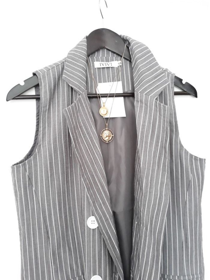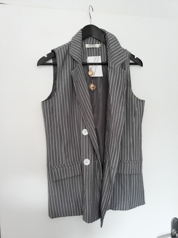 Magnifique veste longue style blazer. Sans manches. Fines rayures verticales Touché effet lin Demandez pour des photos portées! Taille S/M